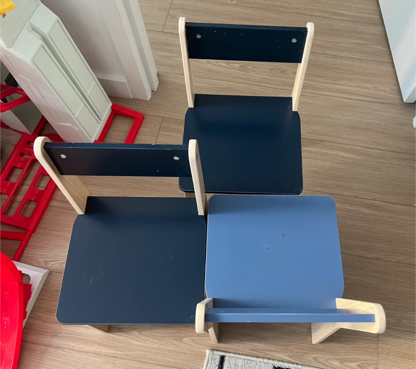 Set of three wooden chairs designed for children. Features a dark navy blue seat and back with a light natural wood frame. One chair has a lighter blue seat. Sturdy construction.