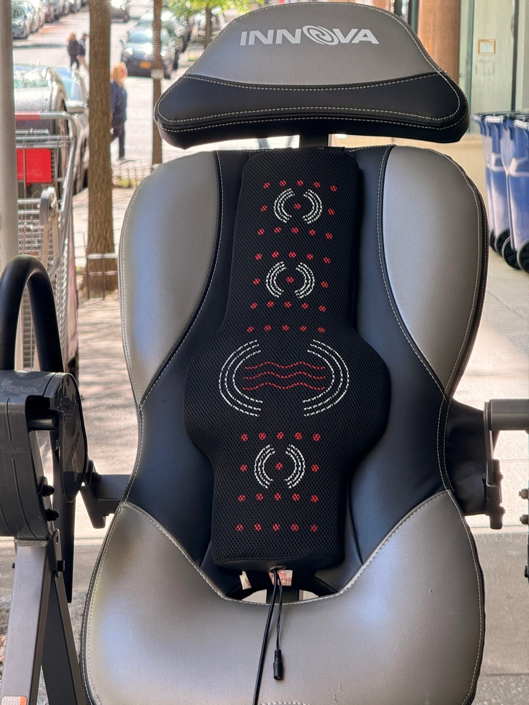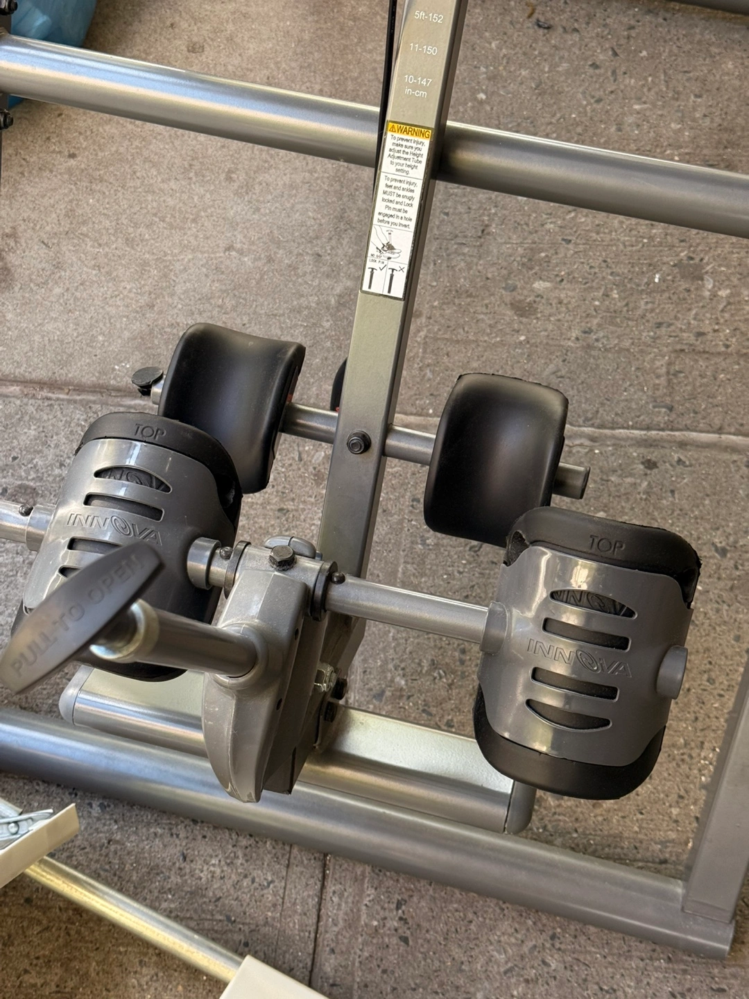 Inversion table, gray and black, good condition. Features include a padded backrest and footrests. Easy to use. Great for back pain relief.
