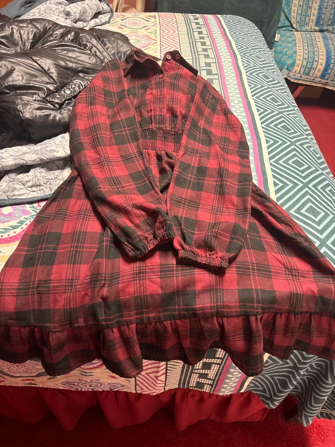 This is a cute red and black plaid flannel dress. It features a smocked waist and a ruffled hem. Long sleeves with elastic cuffs. Perfect for casual wear!