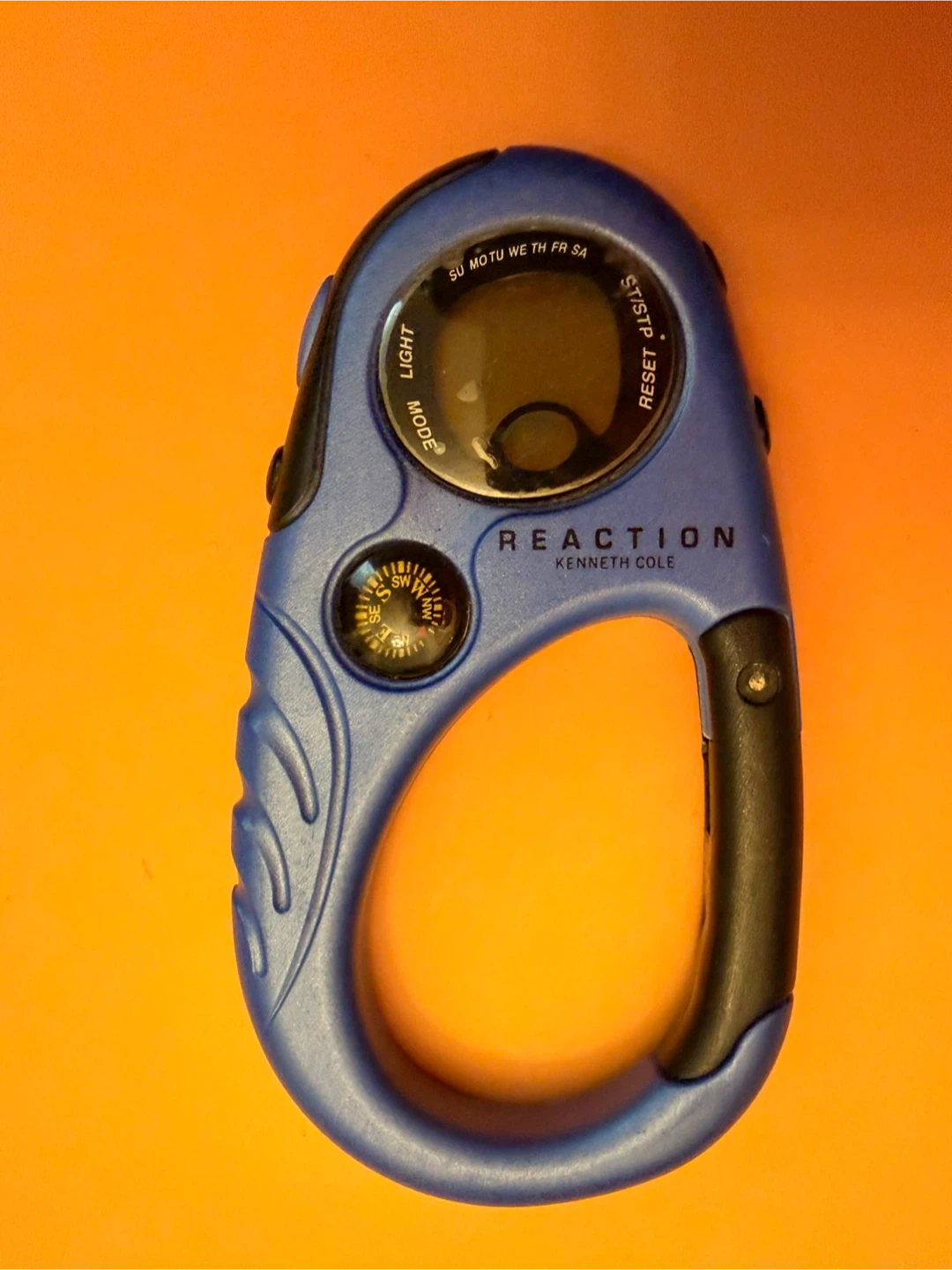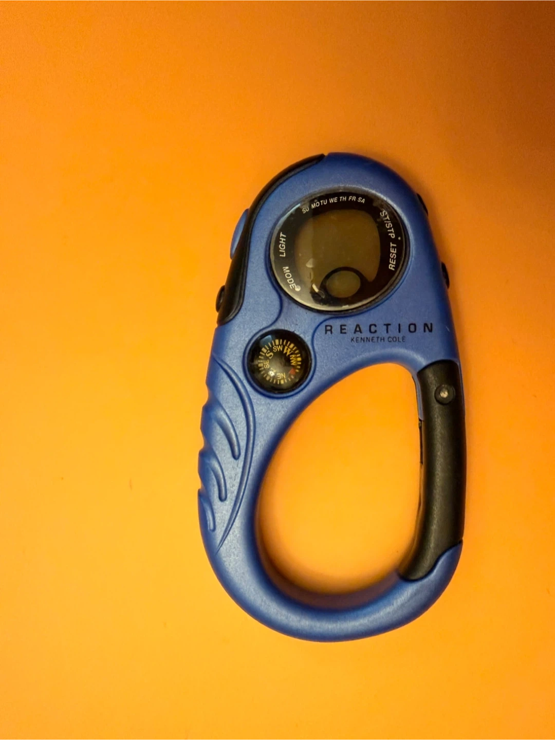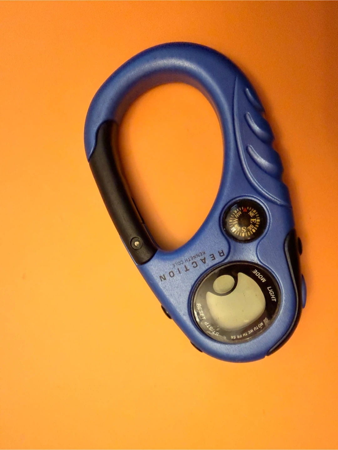 This is a blue carabiner watch with a compass. It has a digital display and a light function. The brand is Kenneth Cole Reaction.