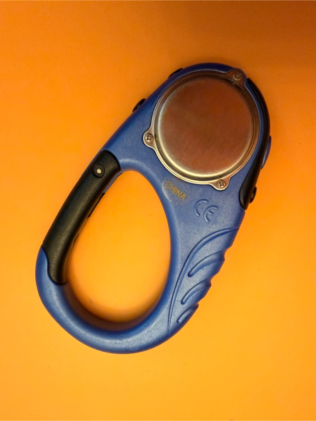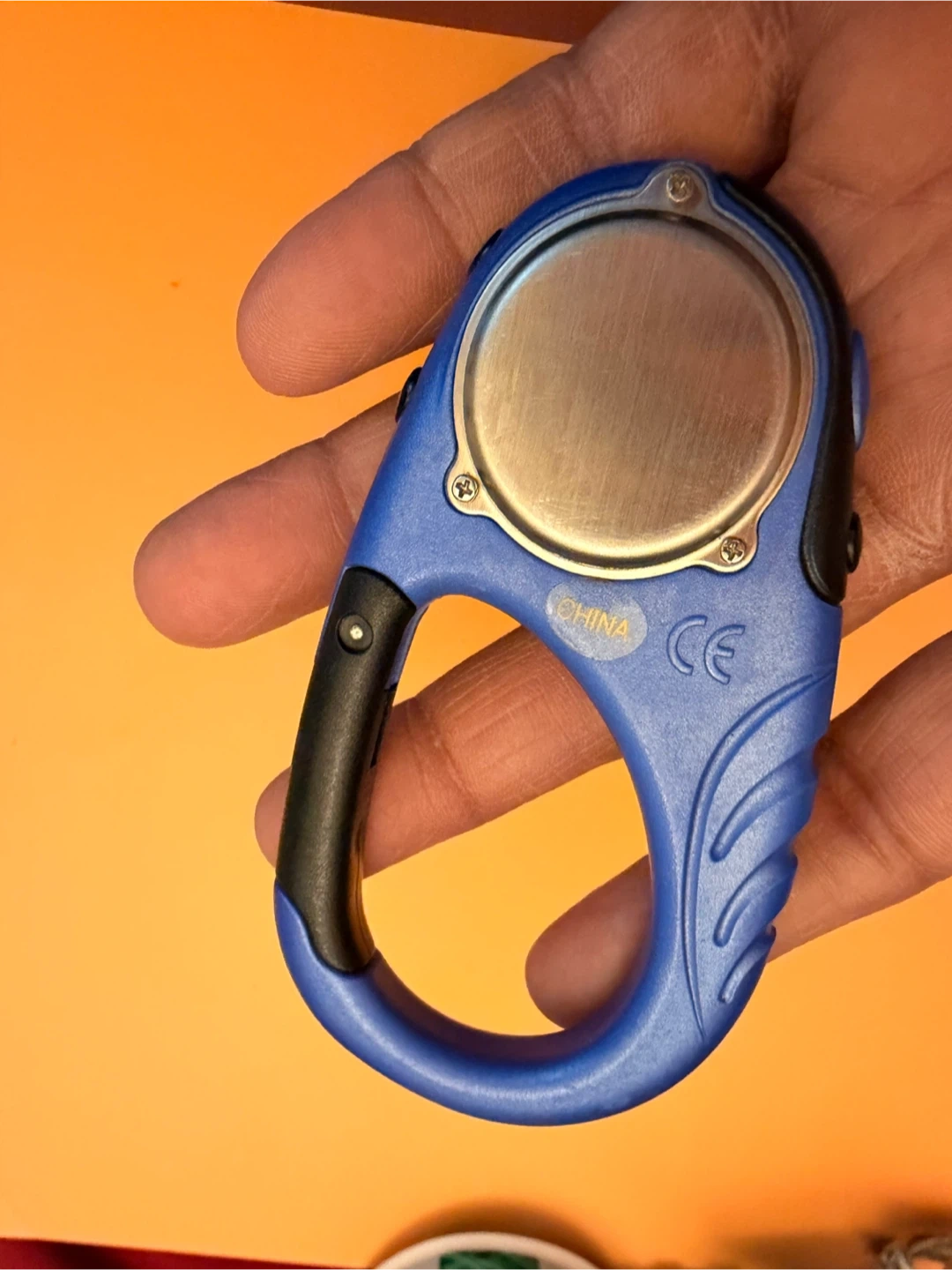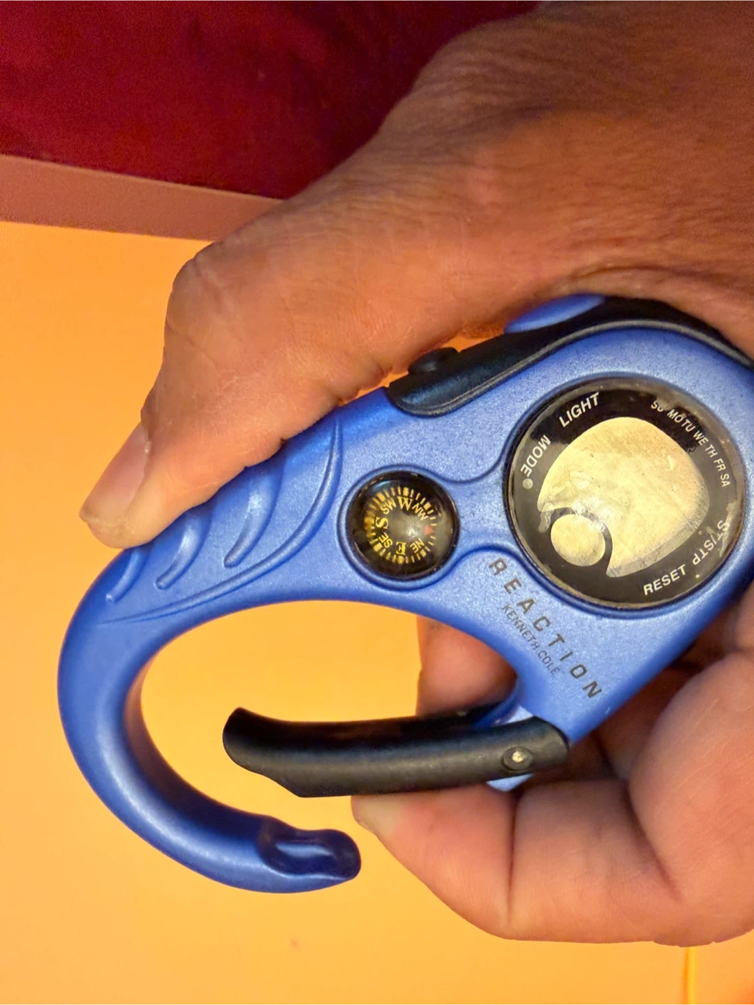 This is a blue carabiner watch with a compass. It has a digital display and a light function. The brand is Kenneth Cole Reaction.