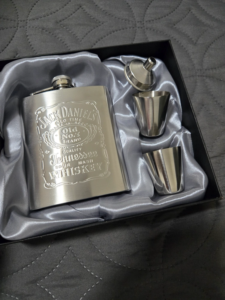 Stainless steel flask set. Includes flask, funnel, and two shot glasses. New in box.