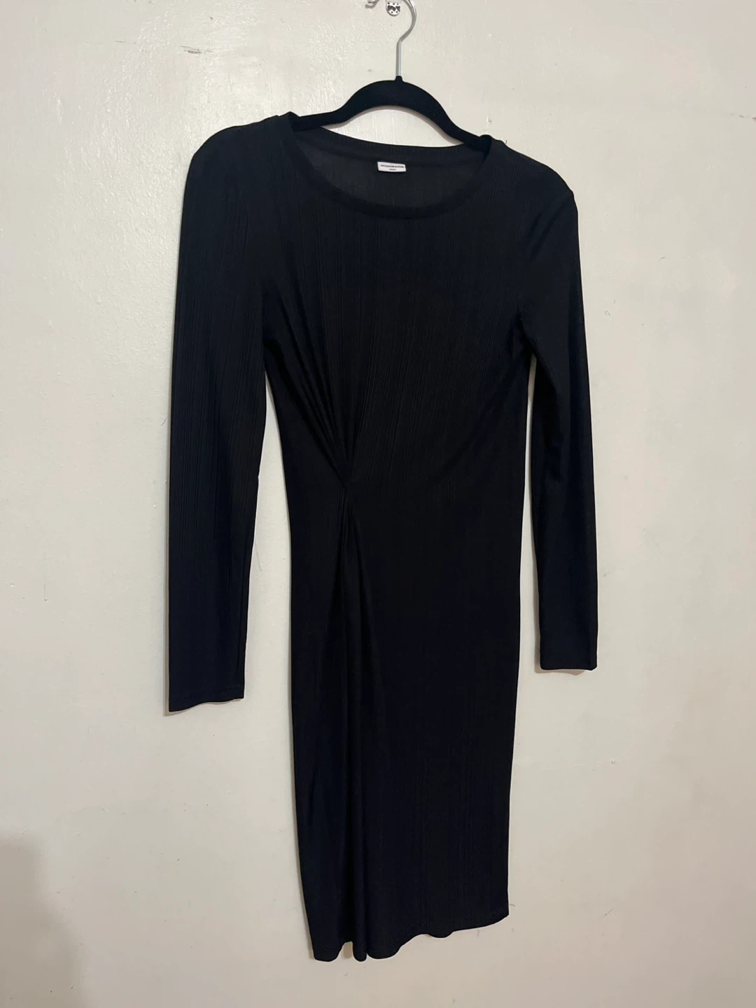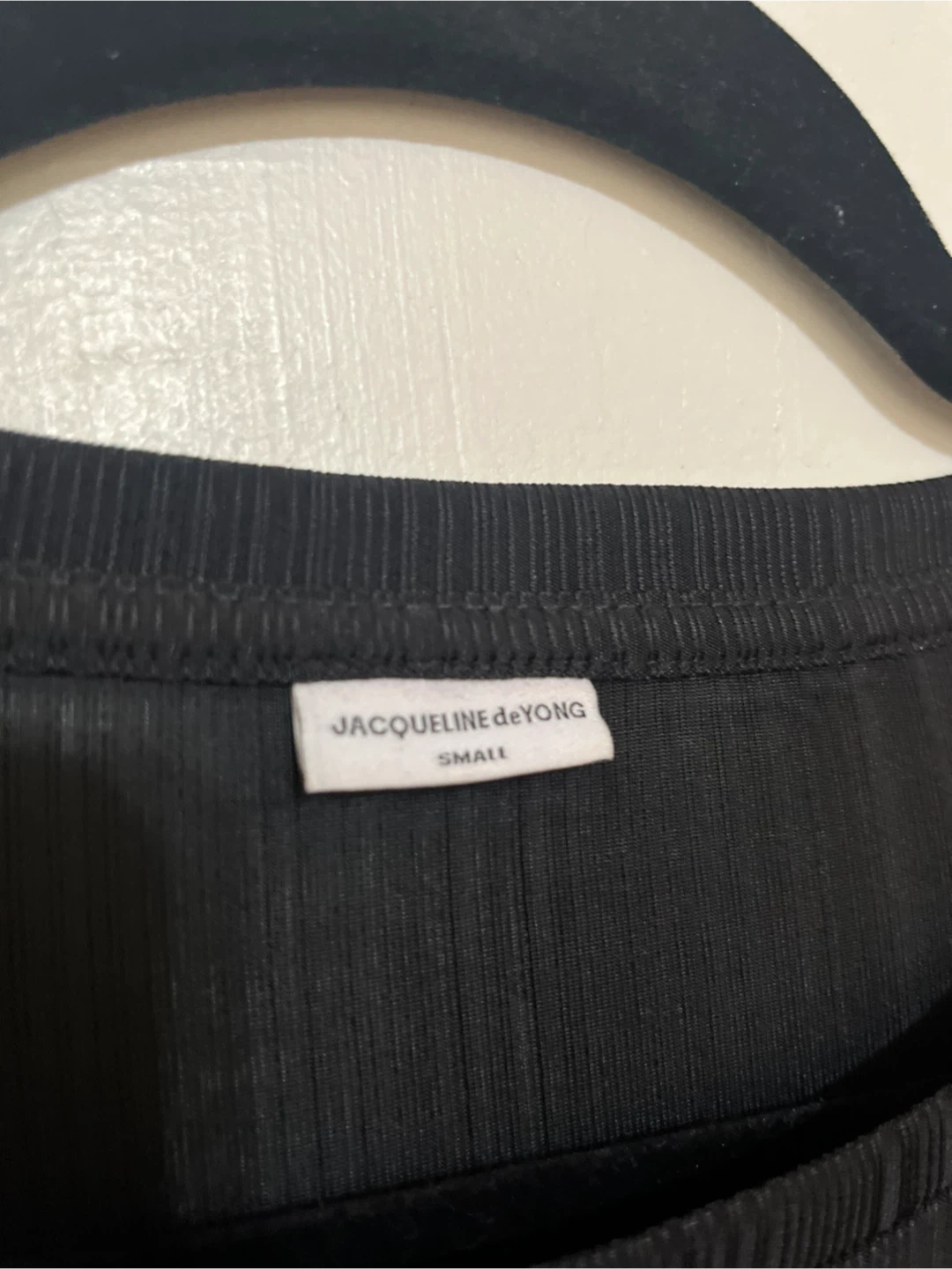Selling a Jacqueline de Yong black dress in size small, originally from ASOS. It features a stylish knot detail. The dress is in great condition, barely worn. However, it’s very see through.