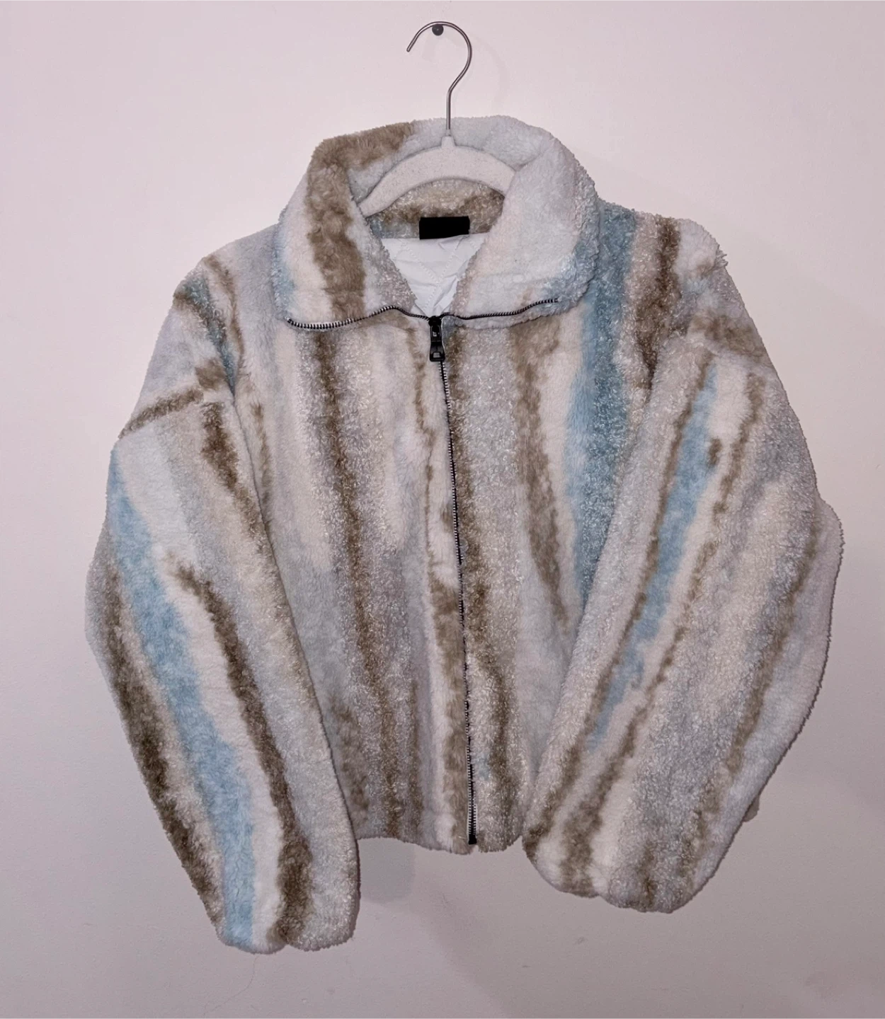 Cozy fuzzy fleece jacket with a colorful stripe pattern. Features a full zip front and a stand-up collar. Made from plush material for warmth.