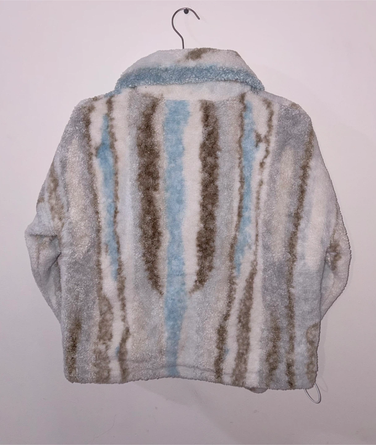 Cozy fuzzy fleece jacket with a colorful stripe pattern. Features a full zip front and a stand-up collar. Made from plush material for warmth.