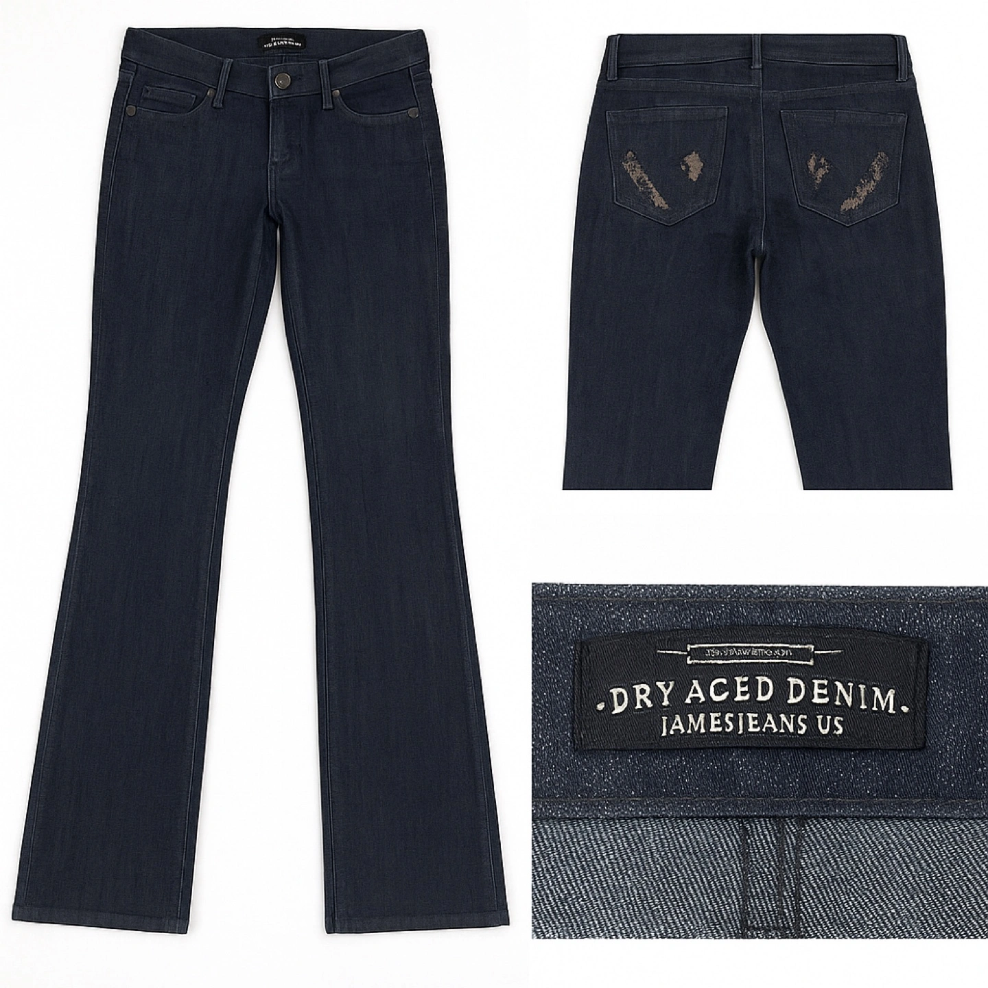 Selling a pair of JAMES JEANS US Dry Aged Denim jeans. They are in great condition and feature a stylish design. Perfect for adding a touch of sophistication to your wardrobe! Add a touch of designer craftsmanship to your wardrobe with these flattering James Jeans “Dry Aged Denim” Limited Edition jeans. Made in the USA, these premium jeans feature soft, structured denim with a dark indigo wash and signature lace-detailed back pockets. • Size: 23 (00 / XXS) • Fit: Bootcut / Straight leg • Color: Deep indigo • Details: Subtle whiskering, lace-accented pockets, “Limited Edition” tag inside waistband • Fabric: Cotton blend, stretch denim • Condition: Excellent condition , no rips or stains noted- tried on only • Made in the USA