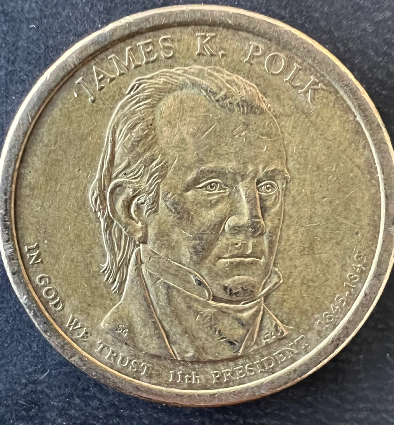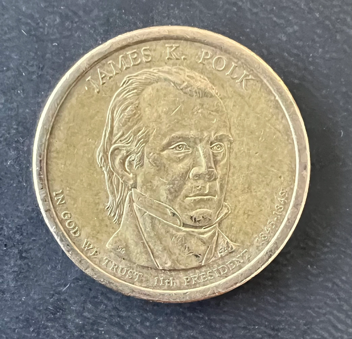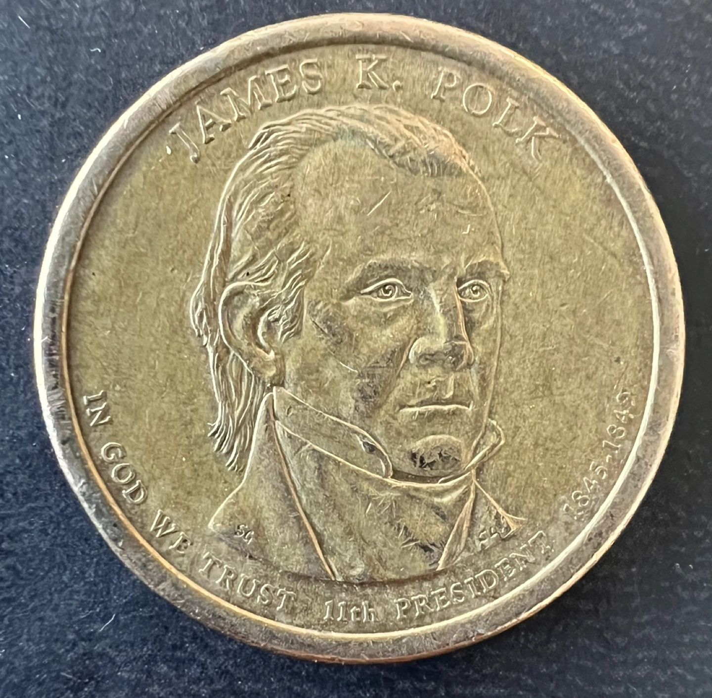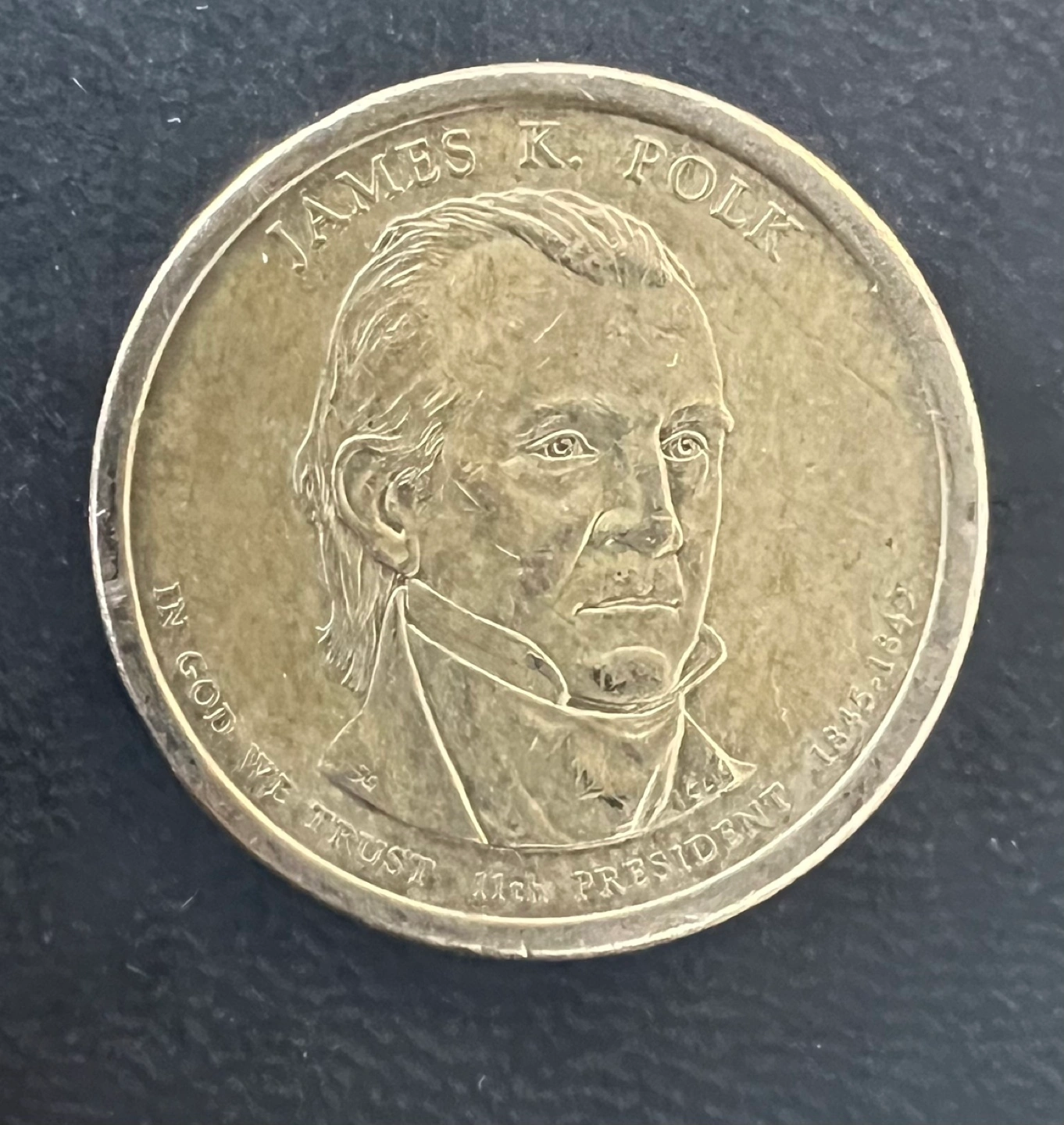 205One dollar coin featuring James K. Polk, the 11th president. Shows years 1845-1849. Reverse side depicts the Statue of Liberty. In God We Trust.