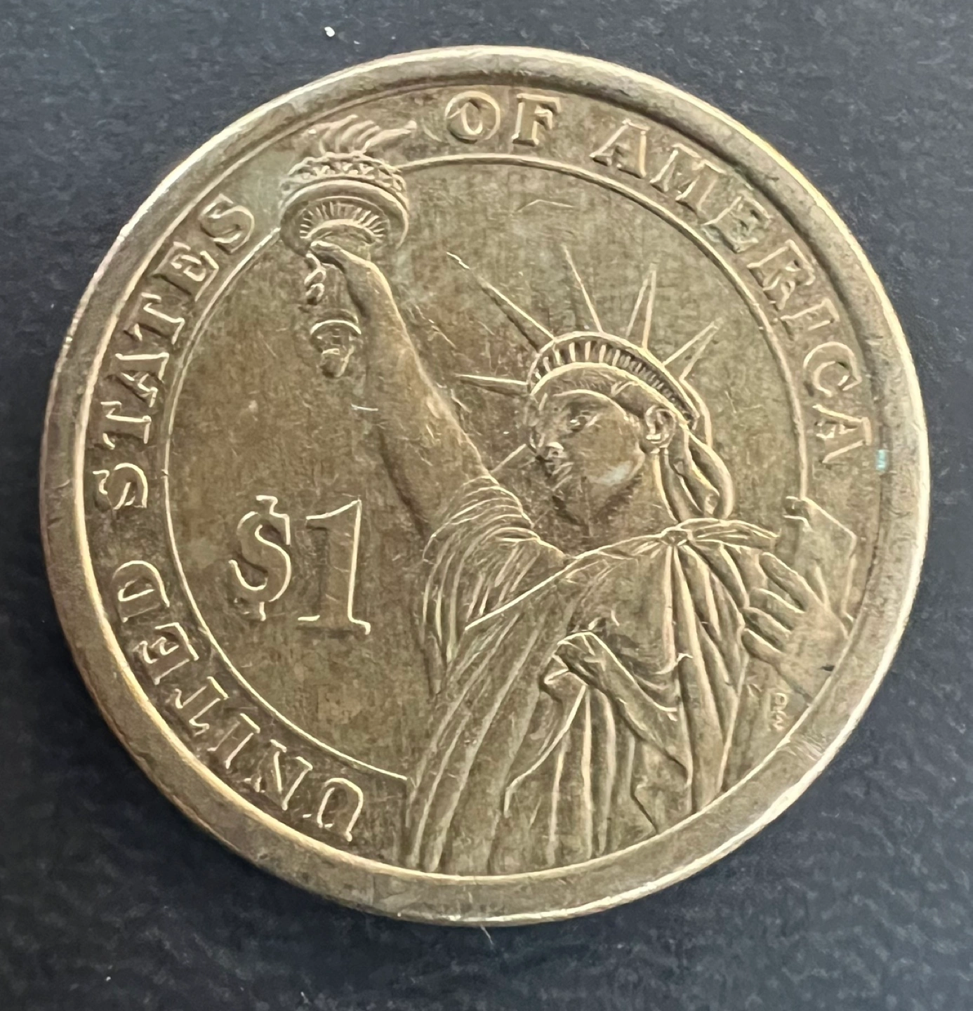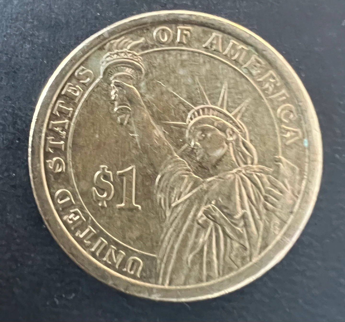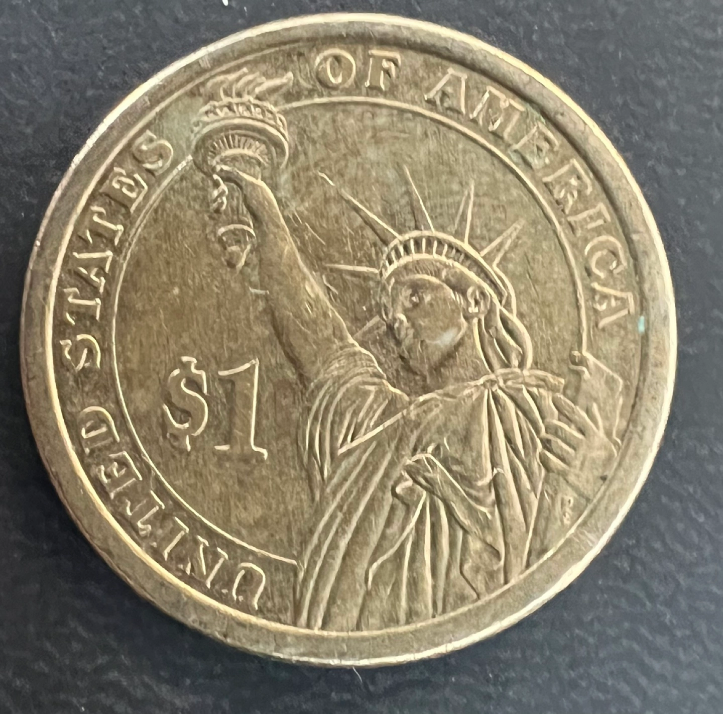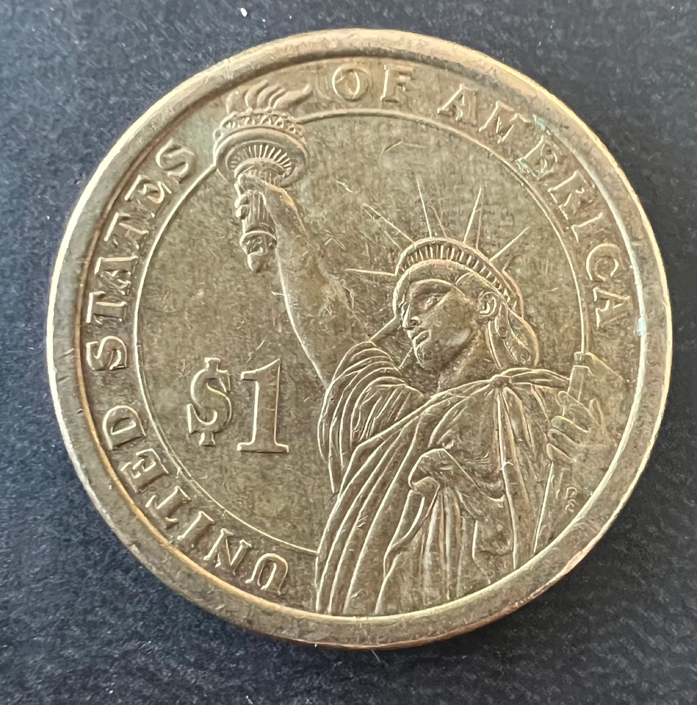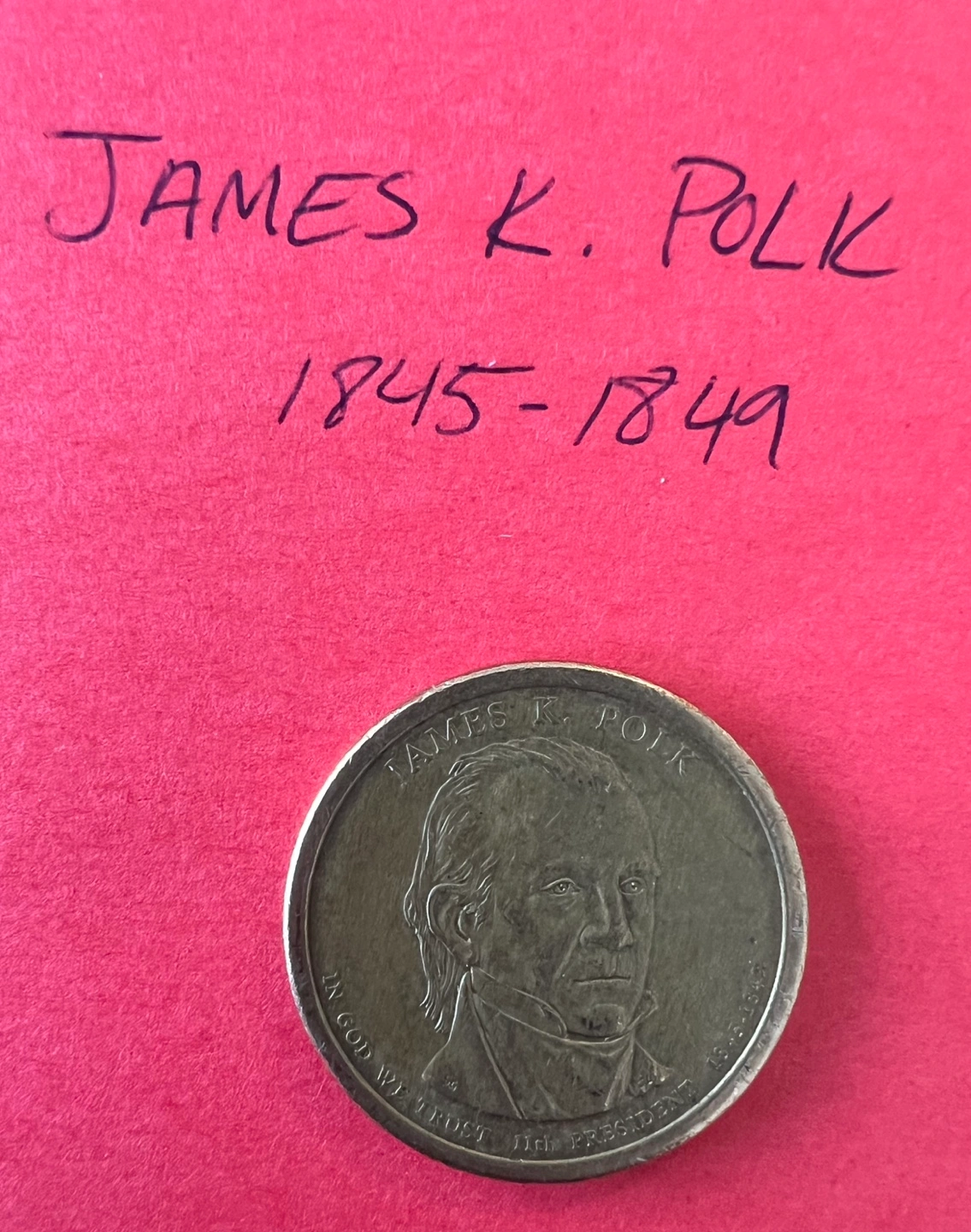 205One dollar coin featuring James K. Polk, the 11th president. Shows years 1845-1849. Reverse side depicts the Statue of Liberty. In God We Trust.
