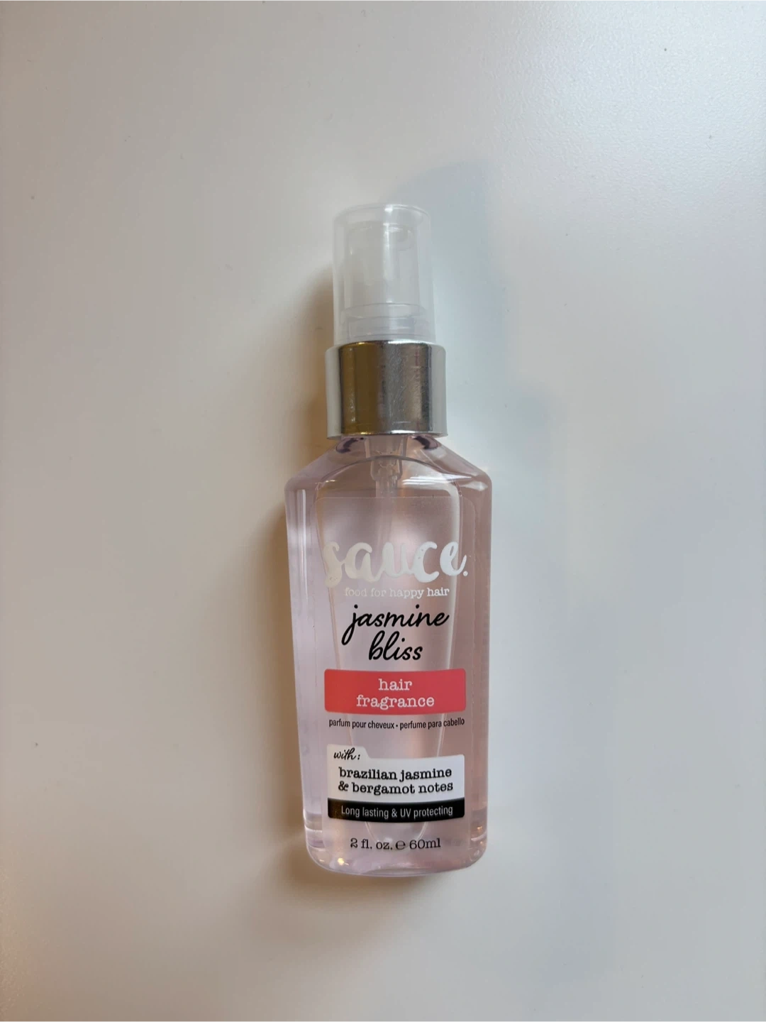 Selling a bottle of Sauce Jasmine Bliss hair fragrance. It's a light and refreshing scent with Brazilian jasmine and bergamot notes. It's long-lasting and UV protecting, and comes in a 2 fl oz (60ml) bottle