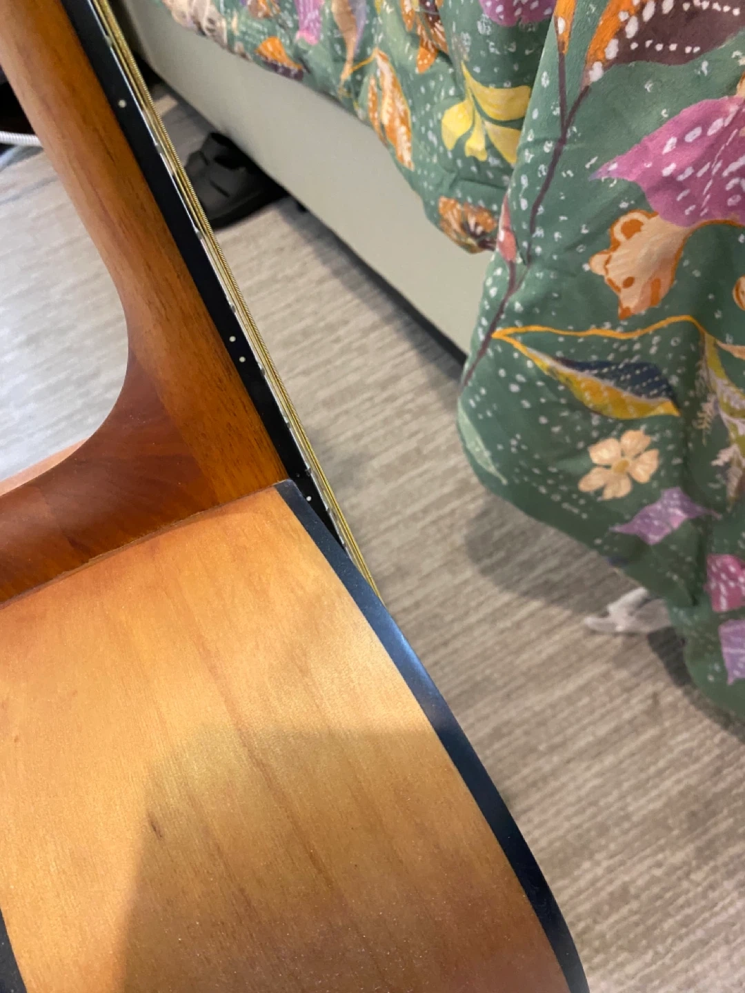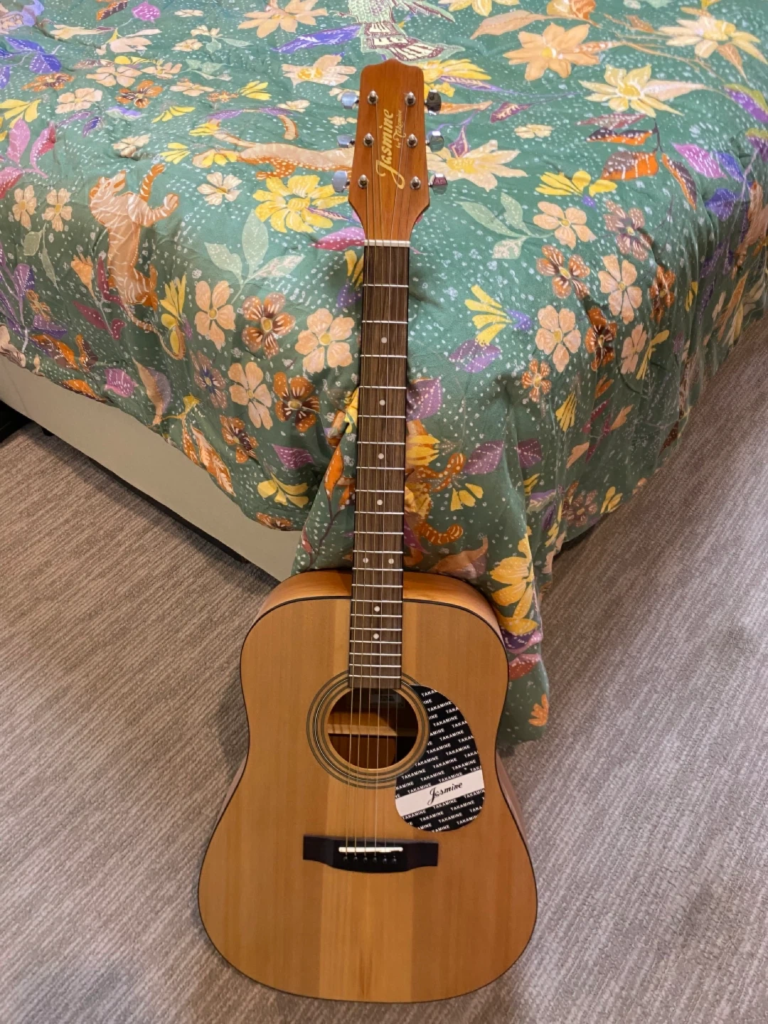 0I have to say this is new since I have never used it. The Jasmine S-35 is a great-looking dreadnought guitar with a big, bold sound and excellent features that represent exceptional value. Great for any player seeking a well-built and easy-playing guitar, the S-35 features a select spruce top with Jasmine’s Advanced “X” Bracing, and agathis back and sides. The slim neck and full 25 1/2″ scale length provide comfortable feel and excellent playability, and the smooth satin finish maximizes resonance for optimal sound quality. Other great features include a rosewood fingerboard and bridge, full body binding and chrome tuners.