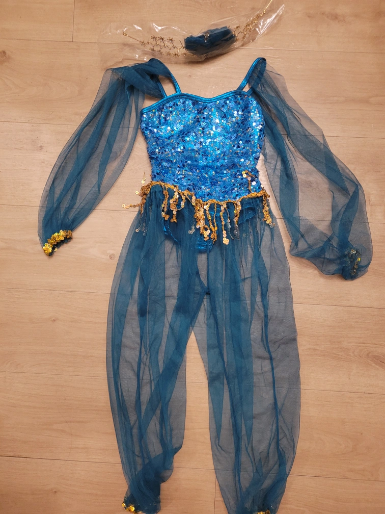 Selling a cute Jasmine-inspired costume! It features a teal, sequined top and sheer pants. Also comes with a matching headpiece. Perfect for dress-up or Halloween!