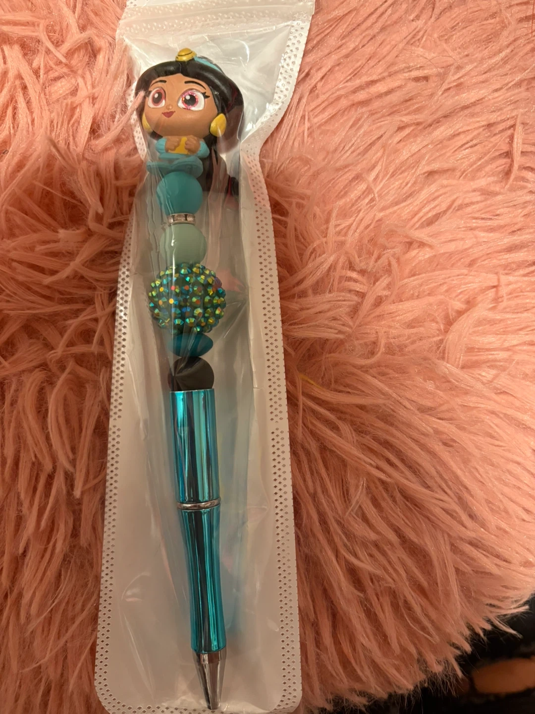 10This is a cute Jasmine princess character pen! It's brand new and still in its original packaging. The pen has a blue barrel and features a fun, colorful design with beads and a Jasmine figurine on top. All custom made
