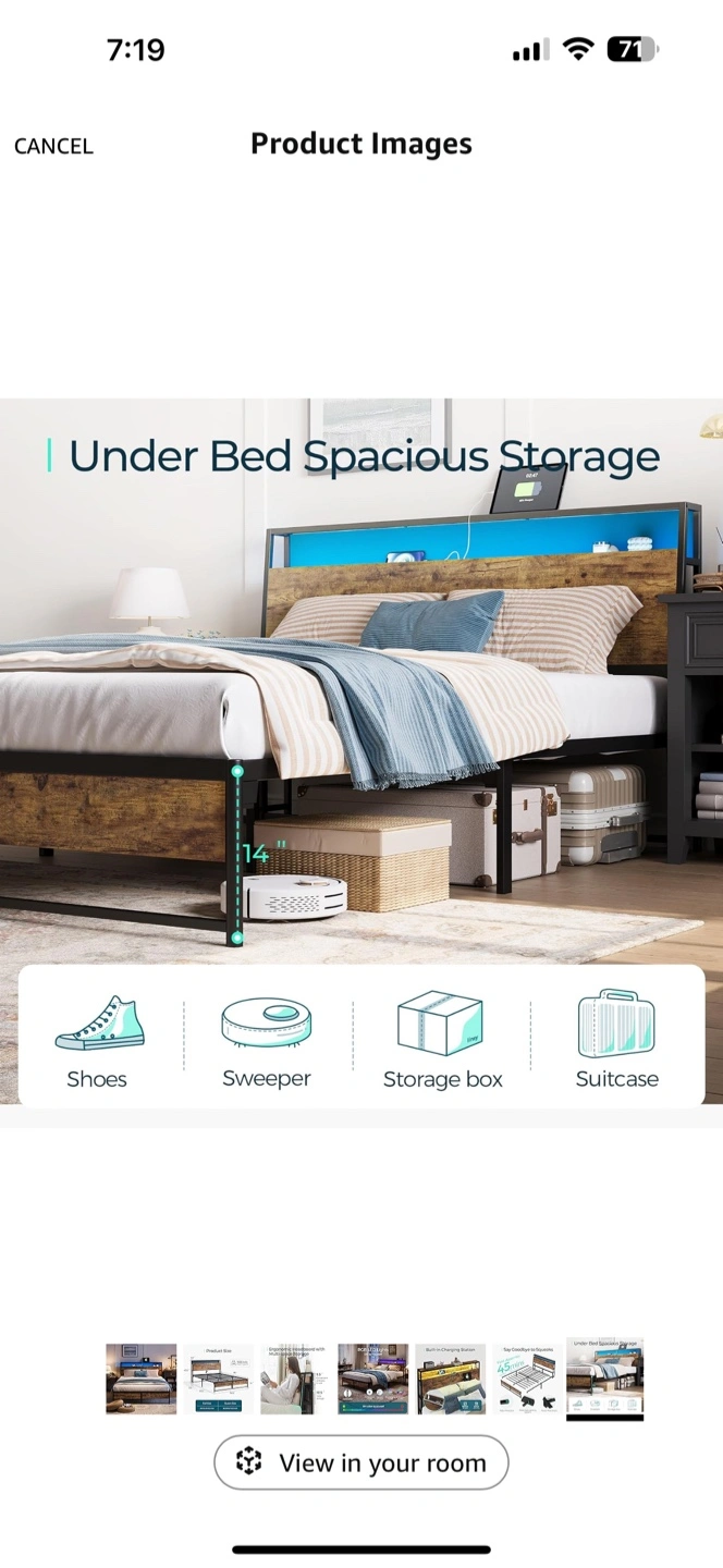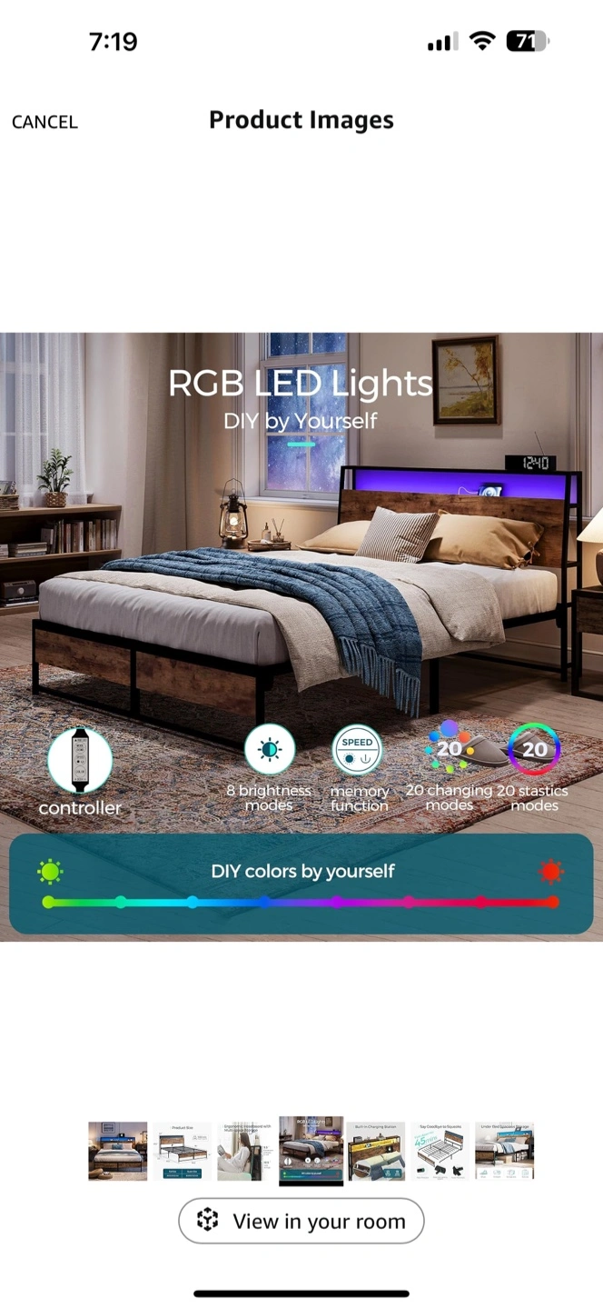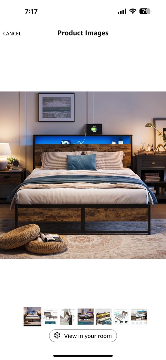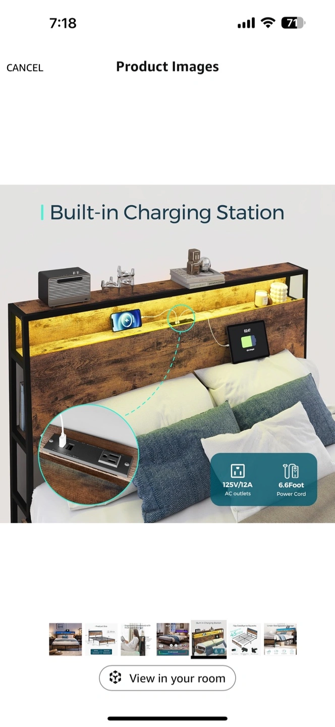 Full size ergonomic headboard metal bed frame. Features built-in charging station with AC outlets and USB ports. Under-bed storage. RGB LED headboard lights. 1500 lbs weight capacity. Brand new in a box
