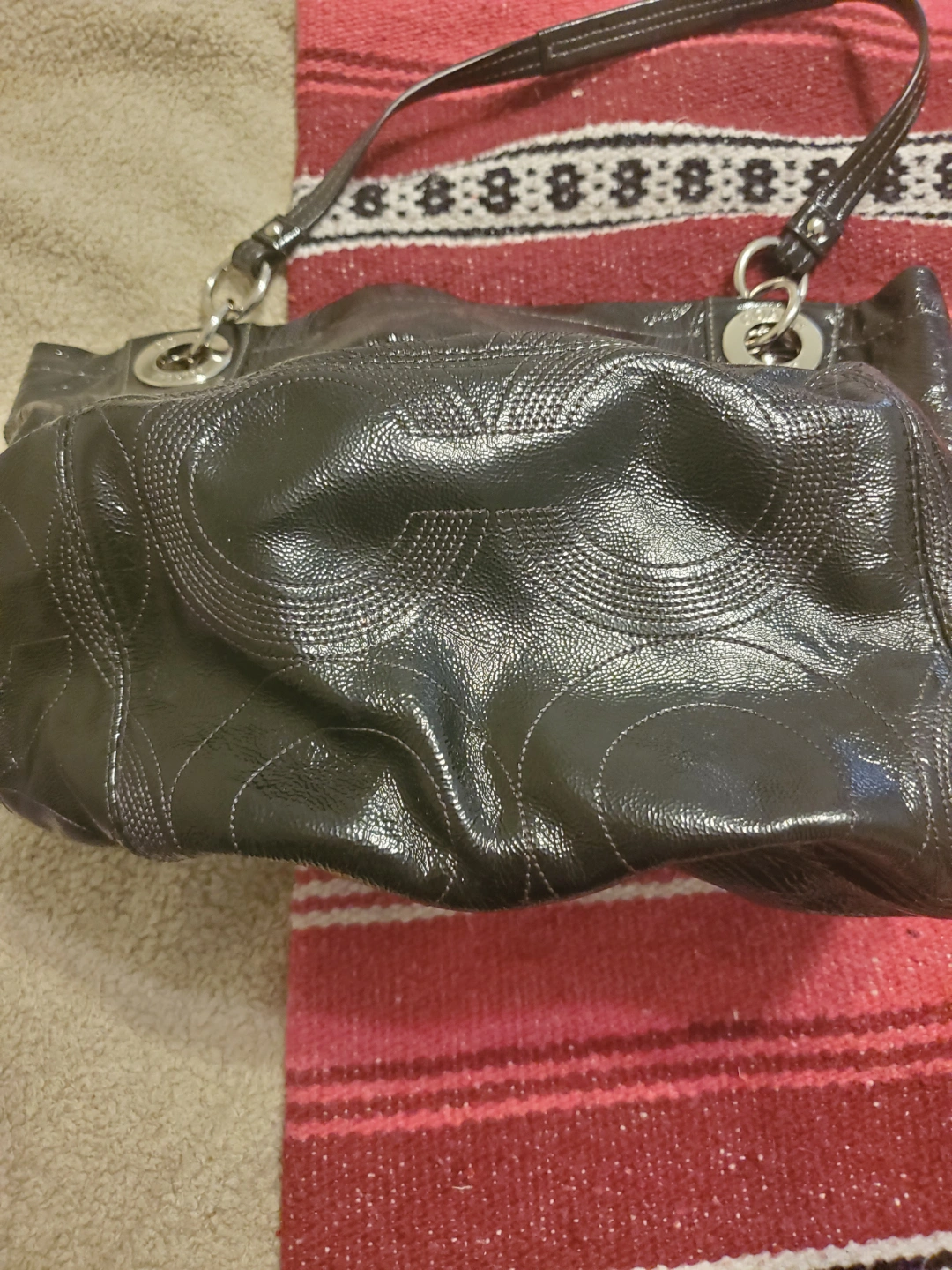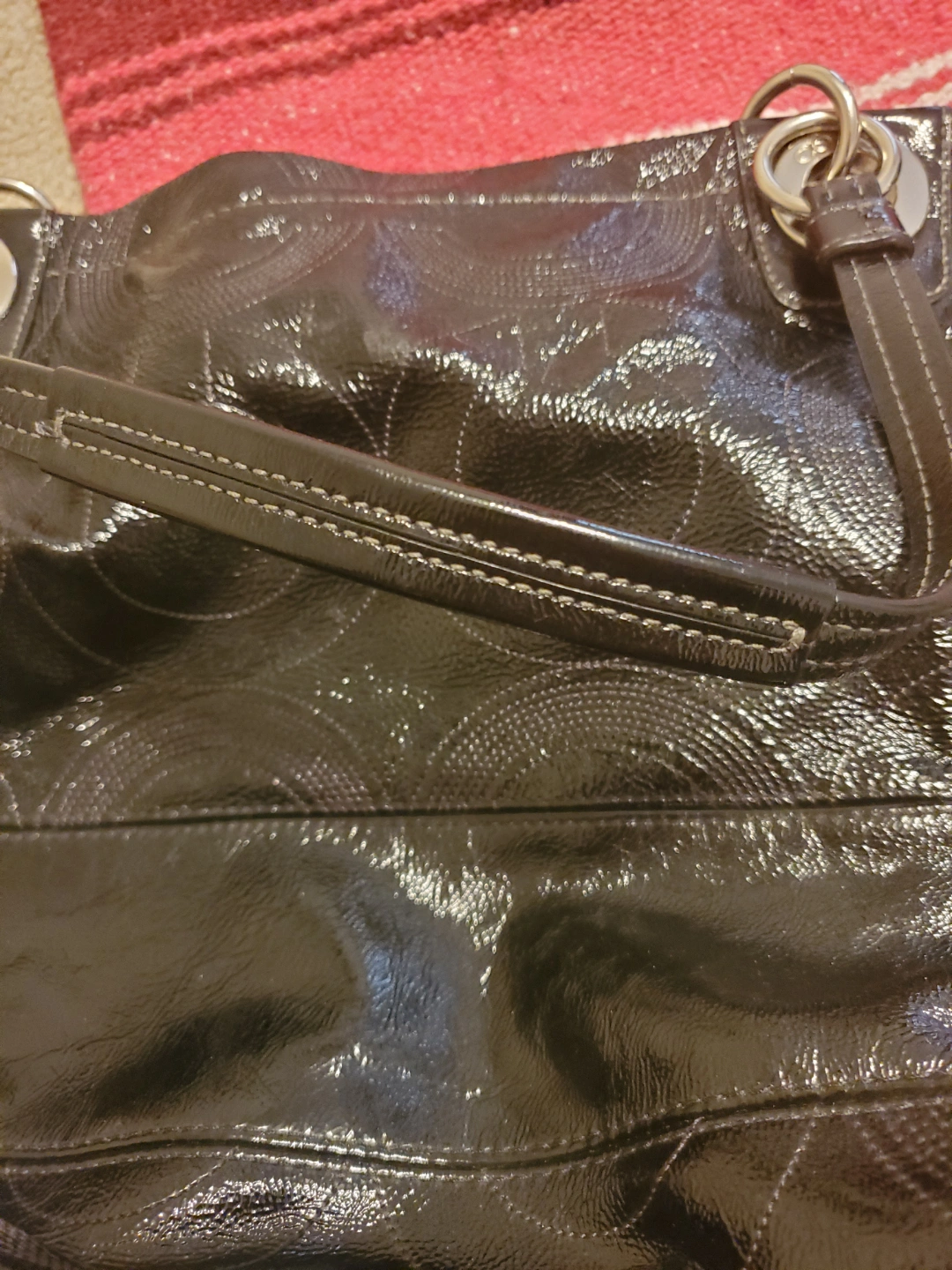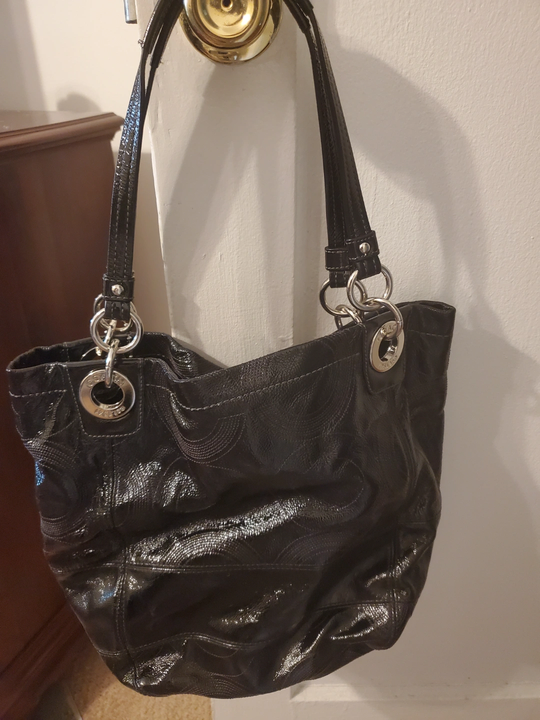 Pre-owned Coach tote bag. Black patent leather. Quilted design. Two top handles. Interior pocket. Dust bag included.