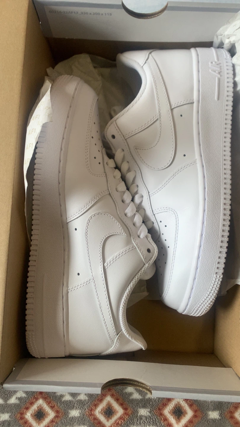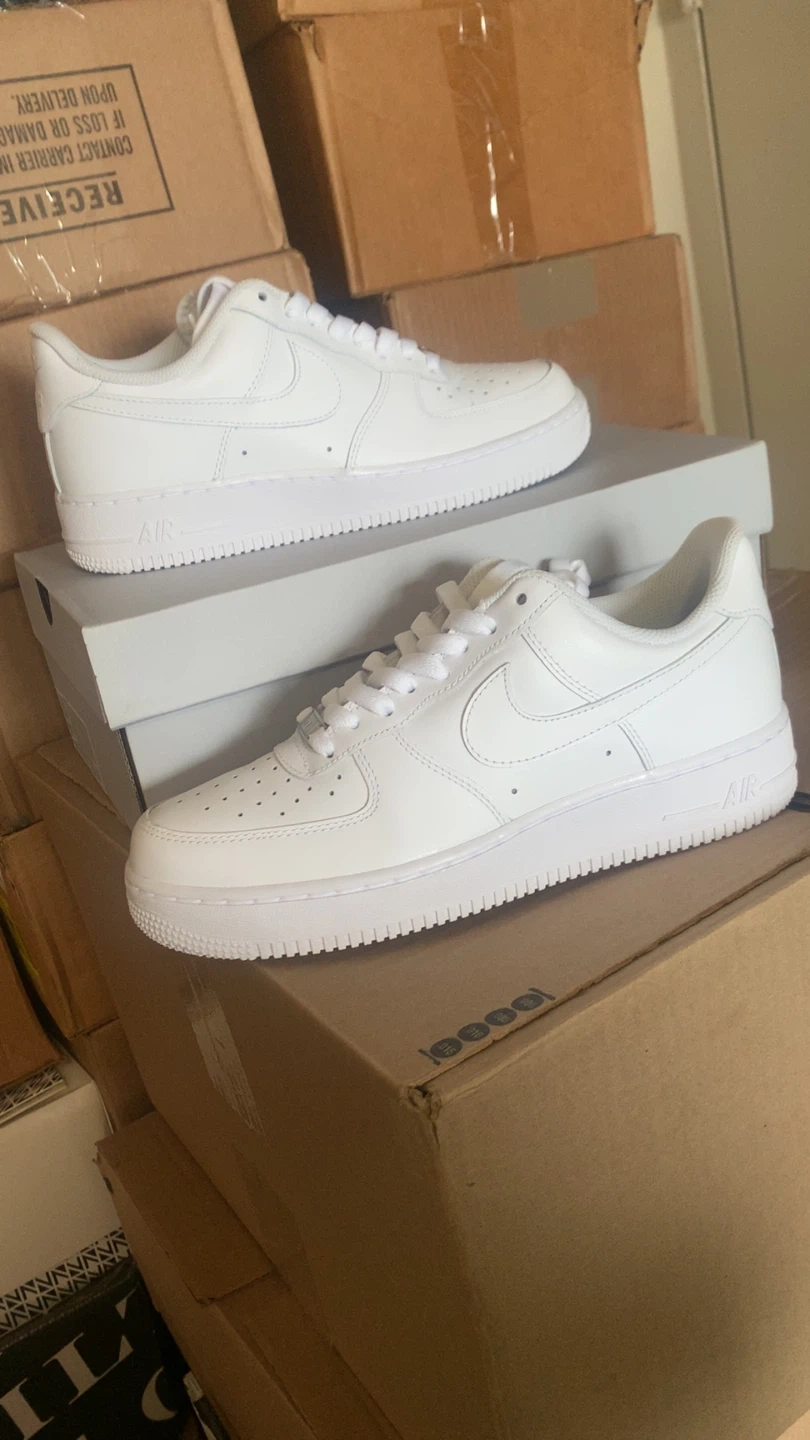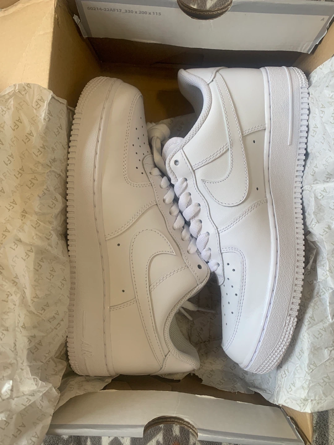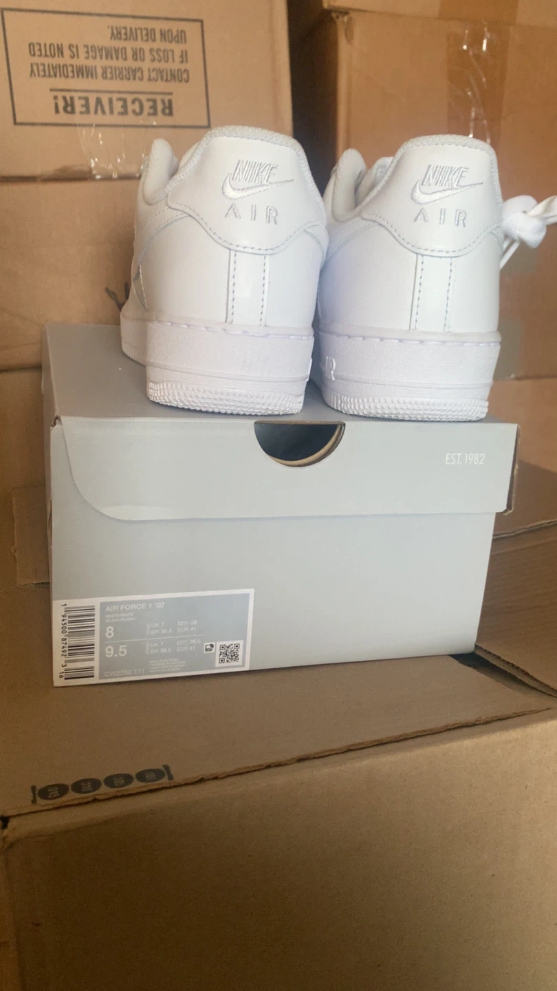 Classic Nike Air Force 1 '07 sneakers in all white. Leather upper. Includes original box. Size 8 US Men's / 9.5 US Women's.