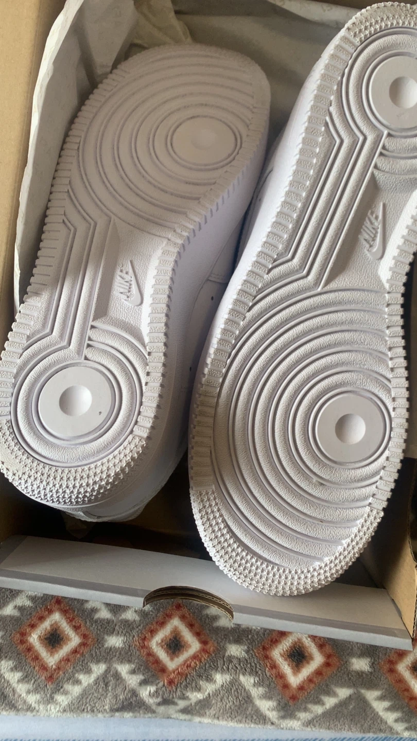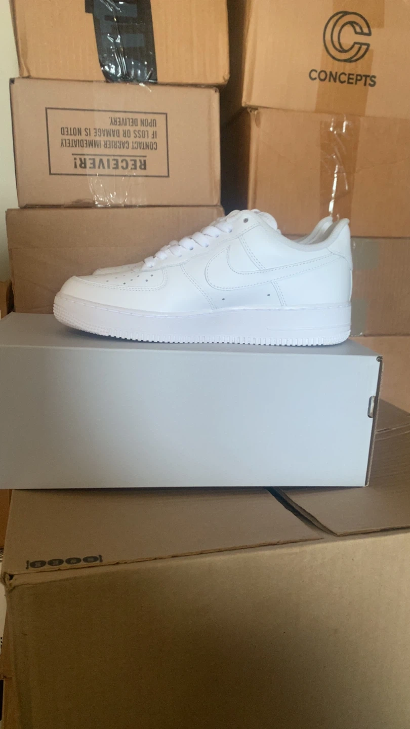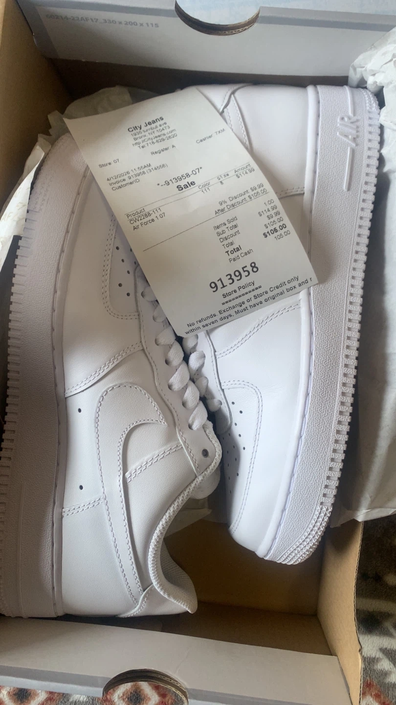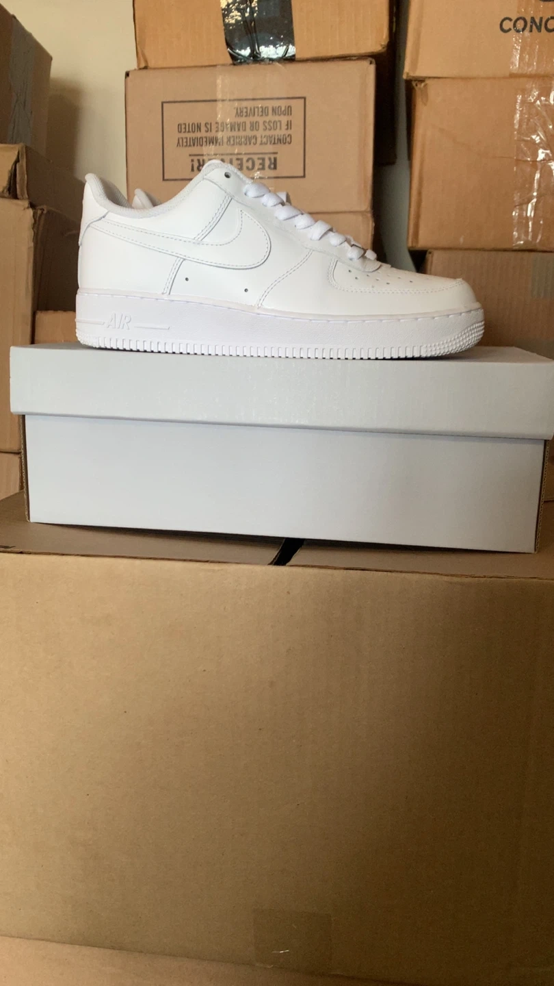 Classic Nike Air Force 1 '07 sneakers in all white. Leather upper. Includes original box. Size 8 US Men's / 9.5 US Women's.