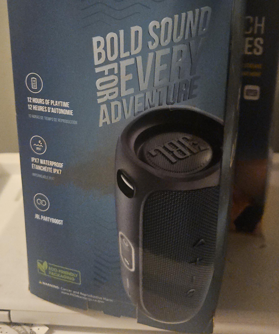 Selling a JBL Go 3 portable Bluetooth speaker! It's perfect for any adventure with its bold sound and compact design. Enjoy up to 12 hours of playtime, and don't worry about splashes with its IPX7 waterproof rating. It also features JBL PartyBoost for even bigger sound
