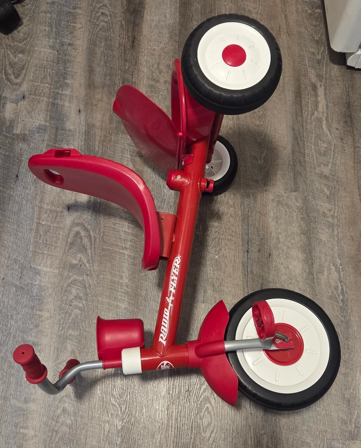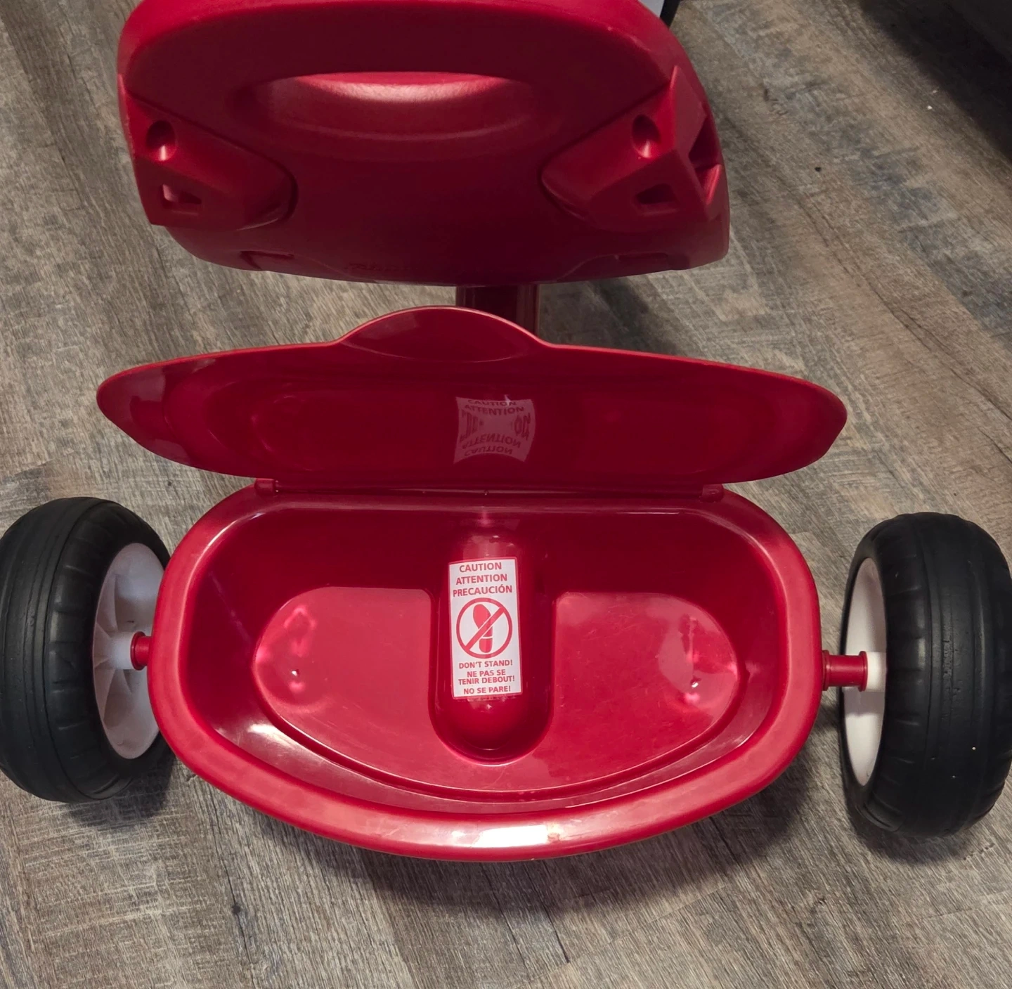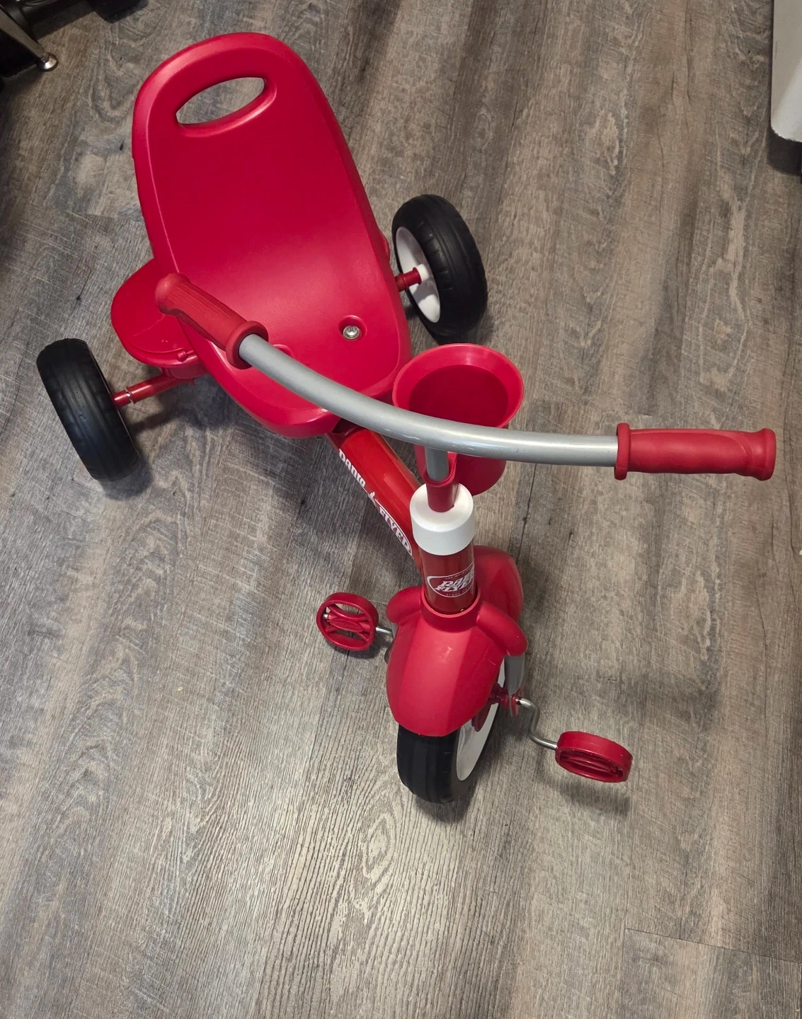 This classic red tricycle is from Radio Flyer. It's made of metal and plastic. Perfect for outdoor play!