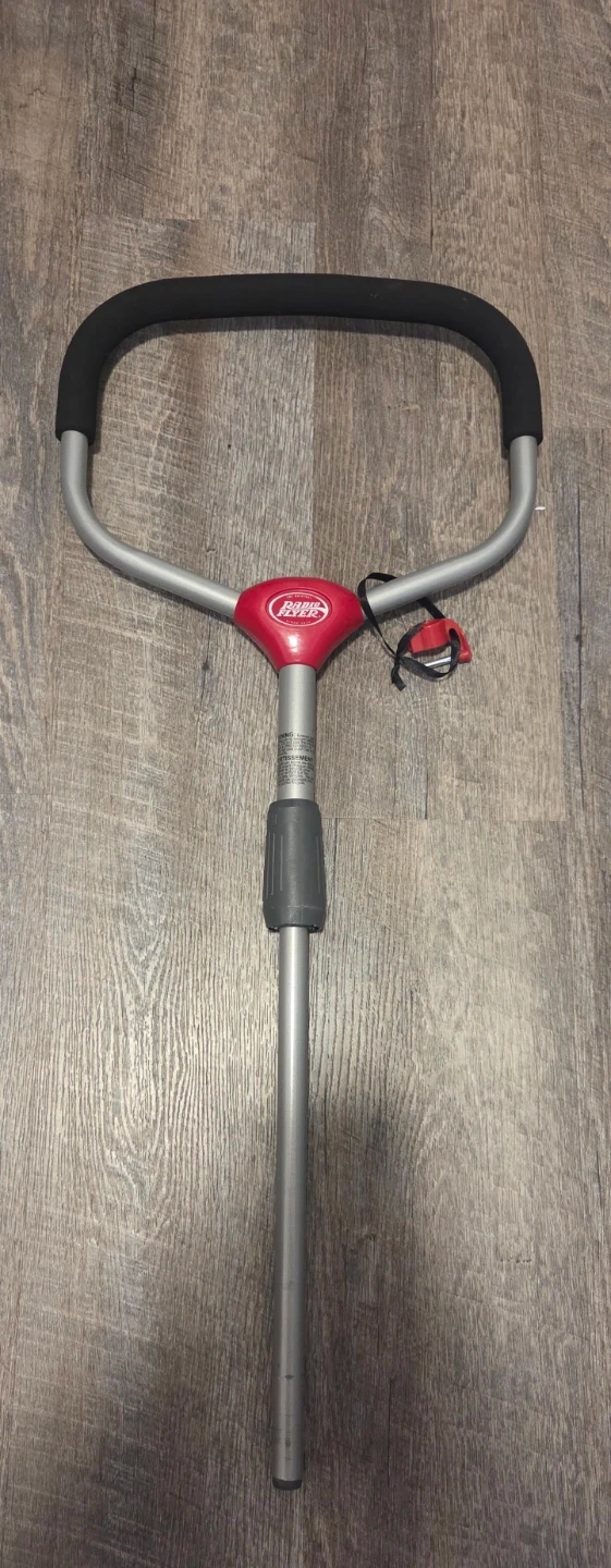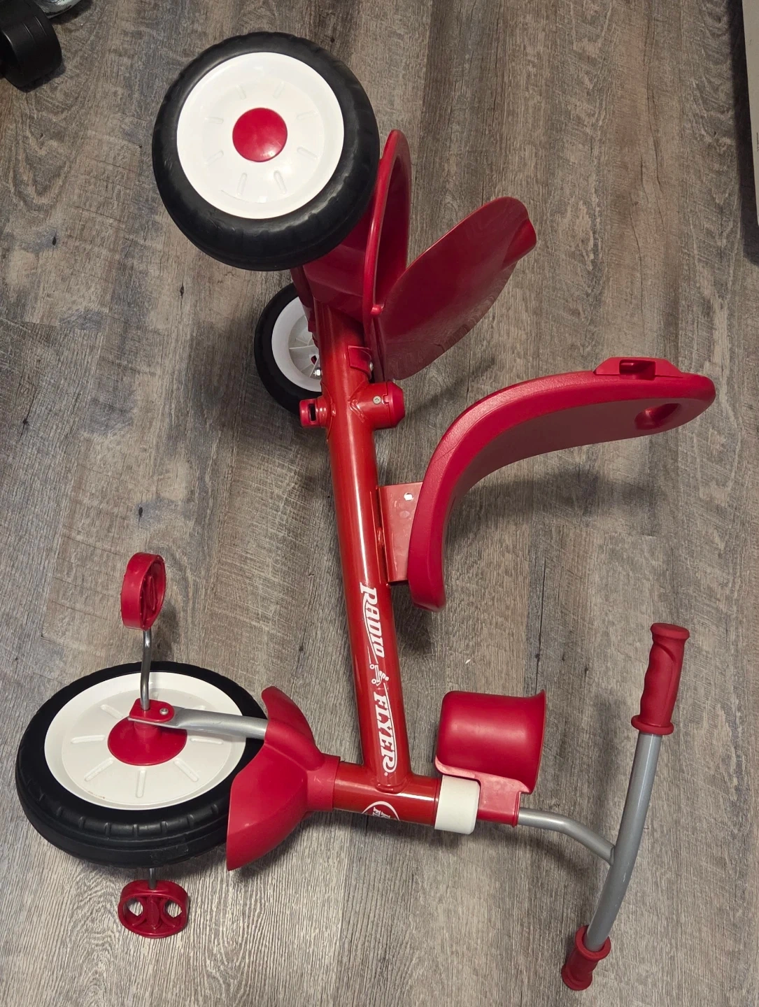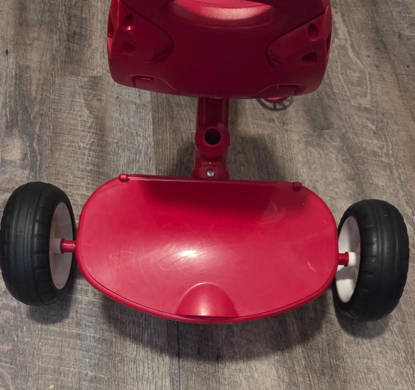 This classic red tricycle is from Radio Flyer. It's made of metal and plastic. Perfect for outdoor play!