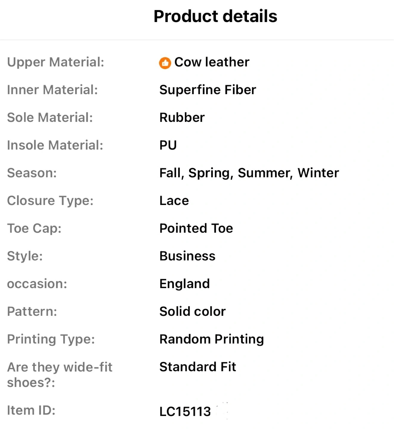 Men's business dress shoes. Cow leather upper, superfine fiber inner, rubber sole, and PU insole. Features a pointed toe, lace-up closure, and solid color pattern. Includes original box.
