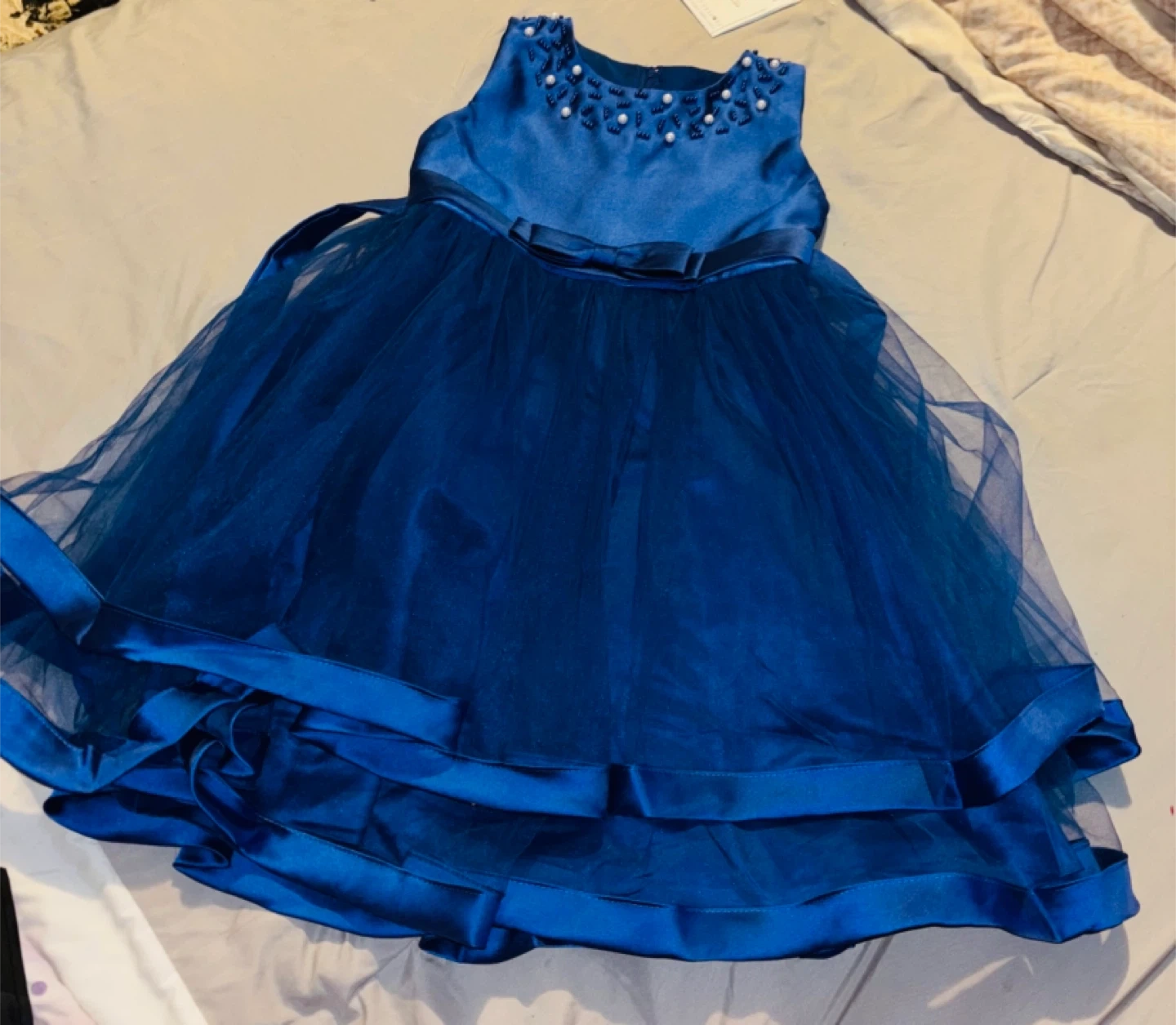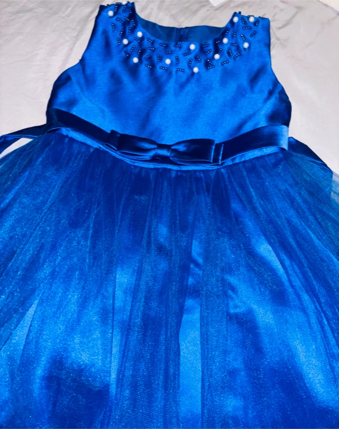 Beautiful royal blue dress with a satin bodice and a sparkly tulle skirt. It features a pearl and beaded neckline and a satin bow at the waist. Perfect for special occasions or parties!
