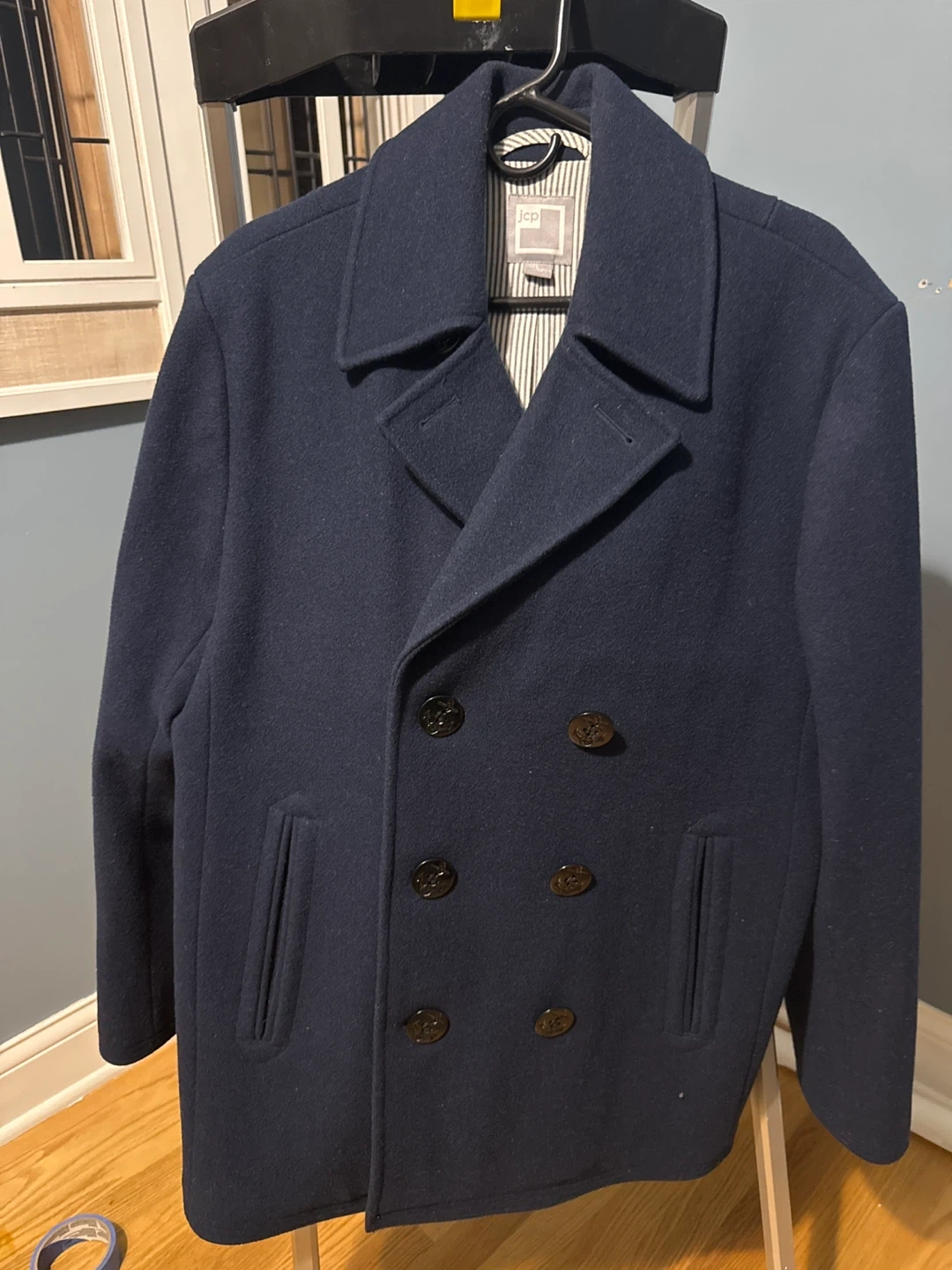 12Selling a classic navy blue pea coat from JCP. It's in great condition and ready to keep you warm! This stylish coat features a double-breasted design with button closures and functional pockets. Perfect for layering during the colder months!
