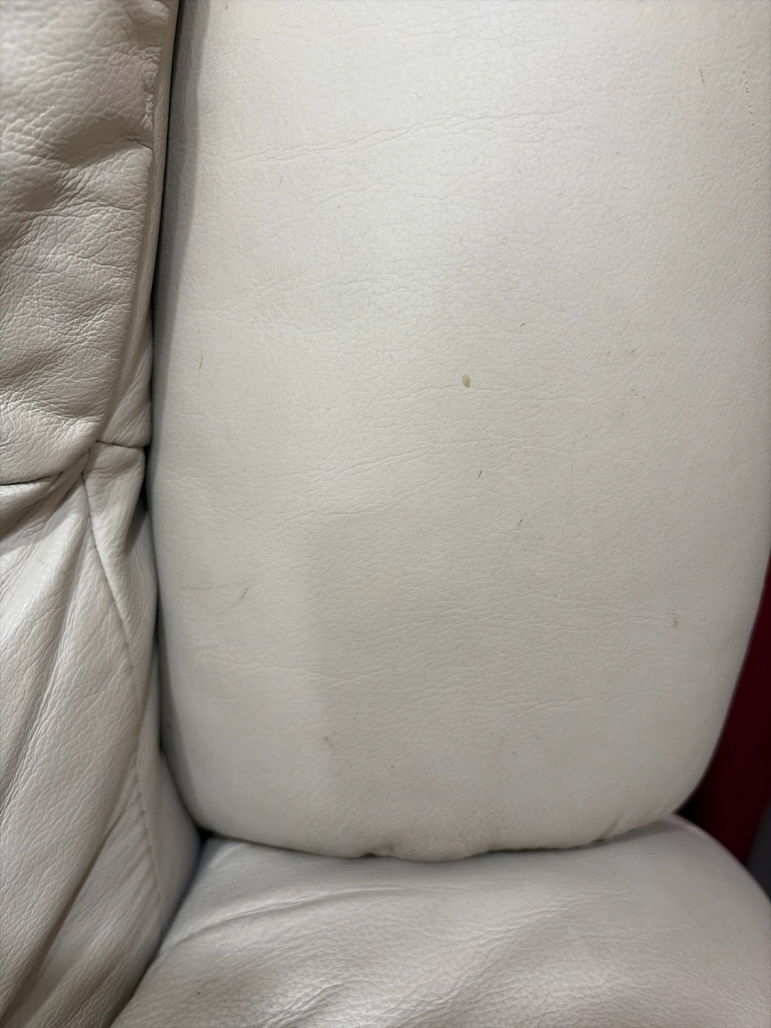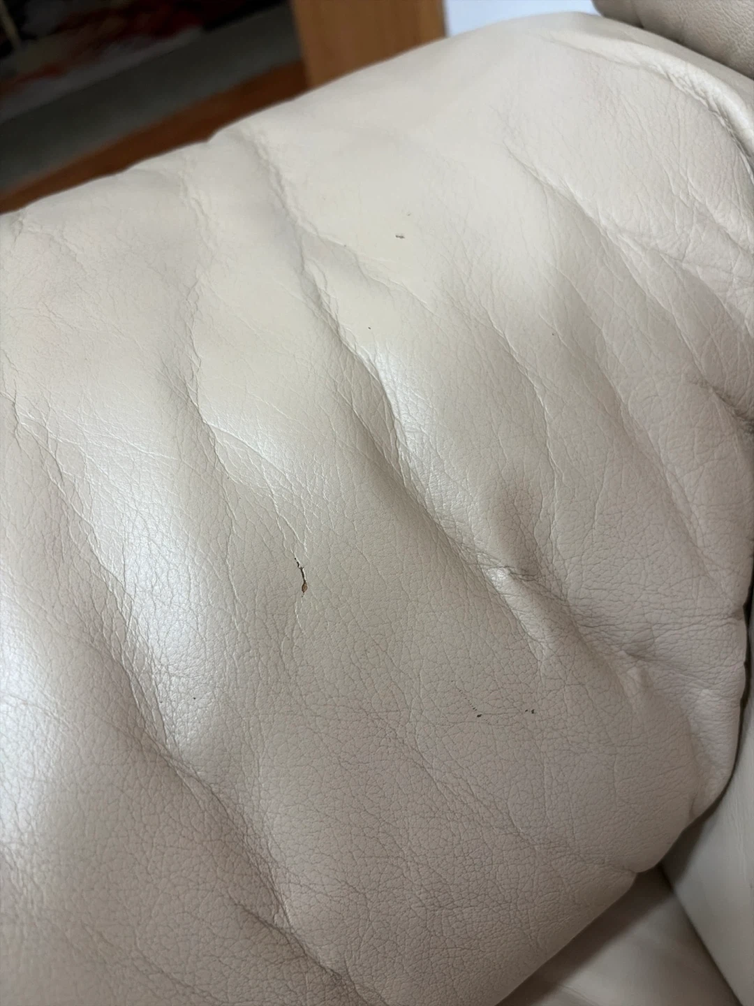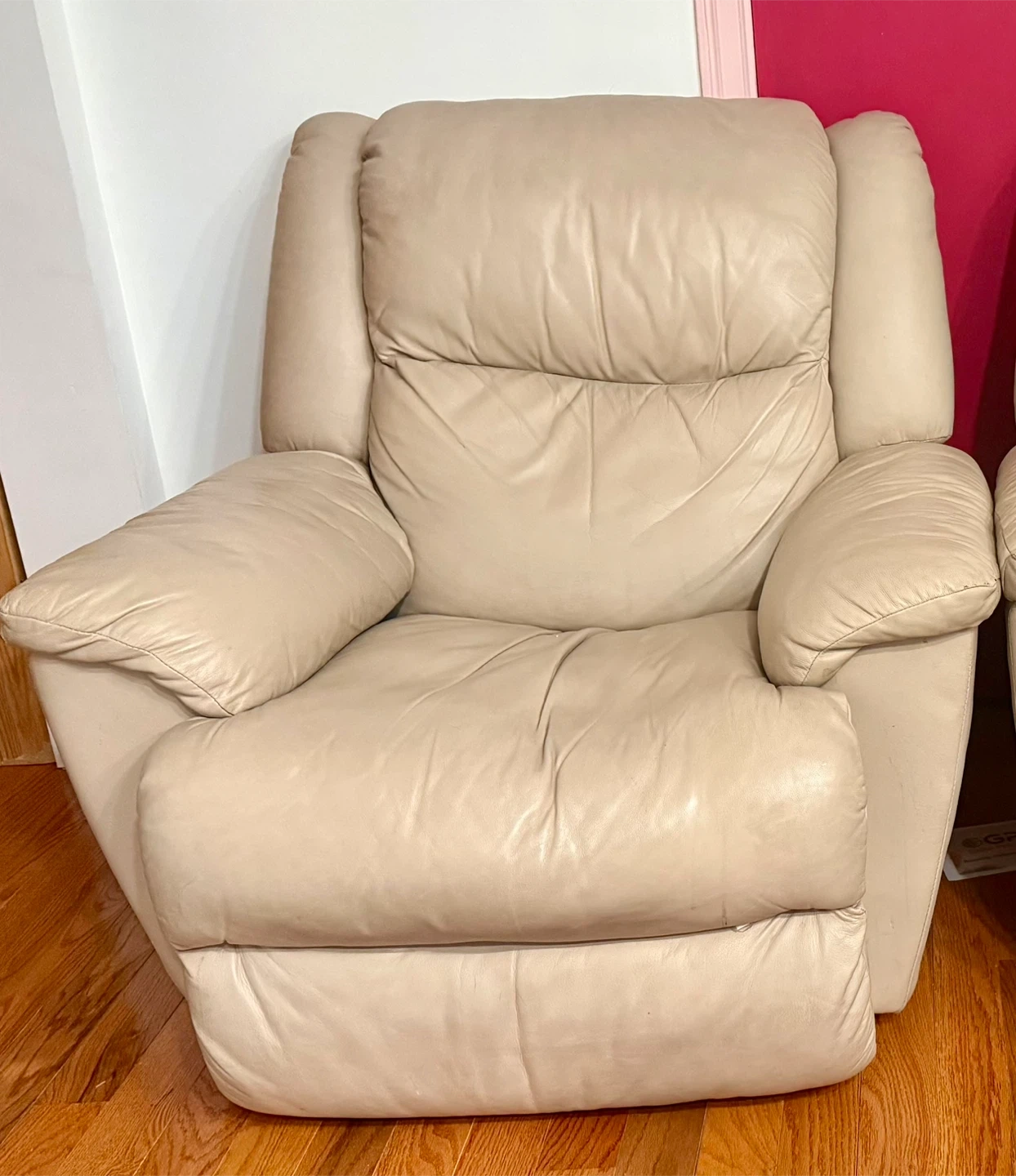 This is a beige leather recliner chair. It features a pull-lever reclining mechanism. The material is leather with some wear on the armrest edges.
