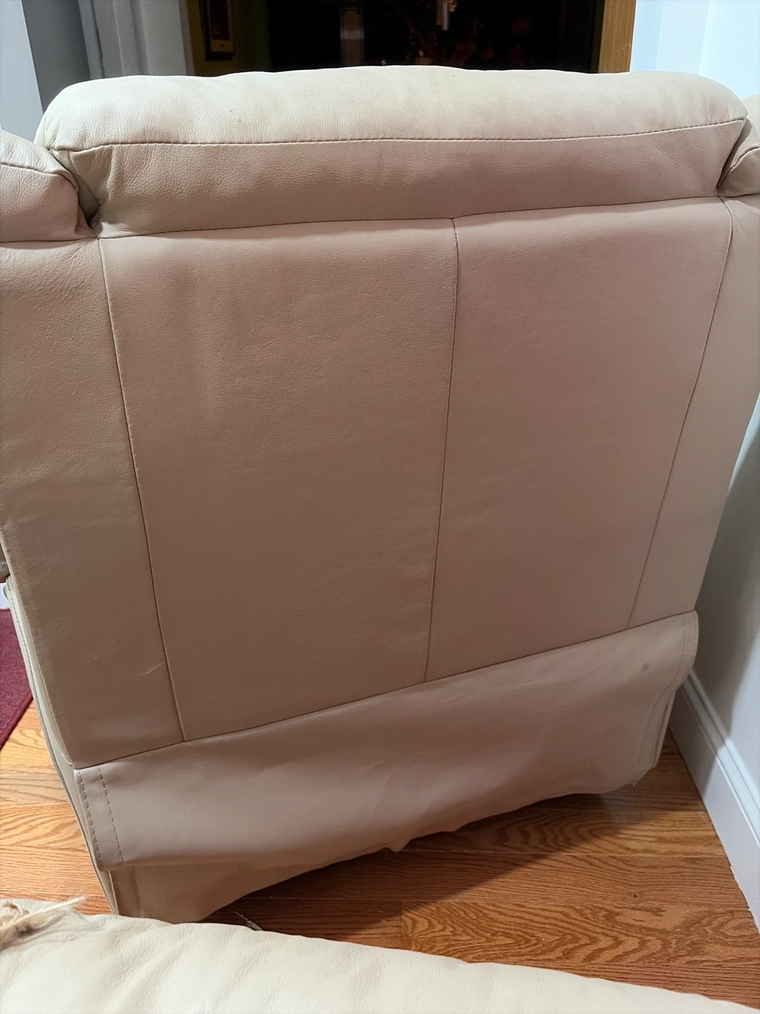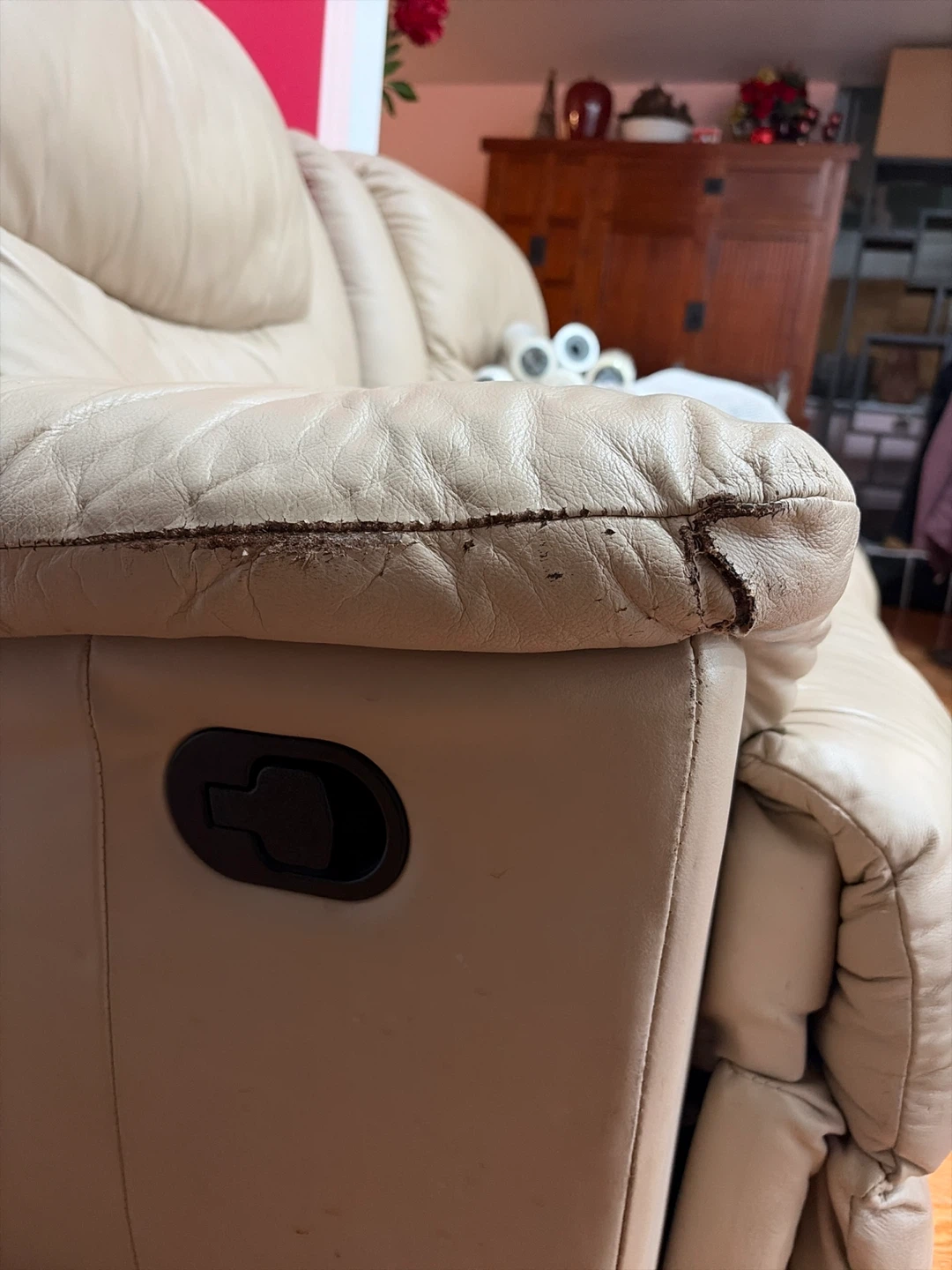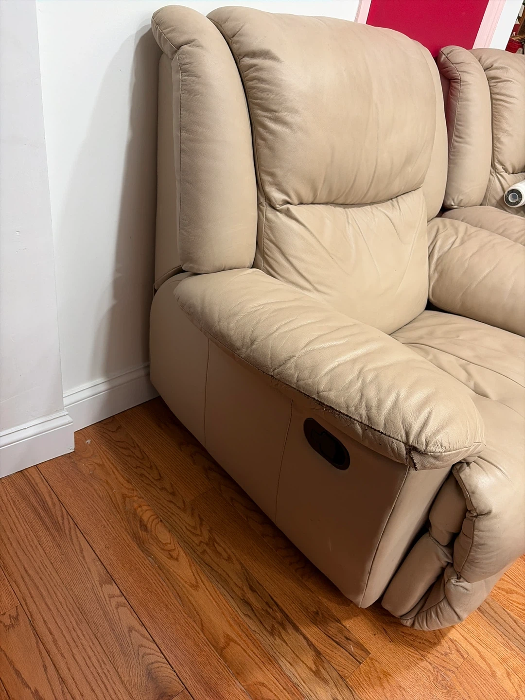 This is a beige leather recliner chair. It features a pull-lever reclining mechanism. The material is leather with some wear on the armrest edges.