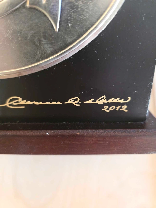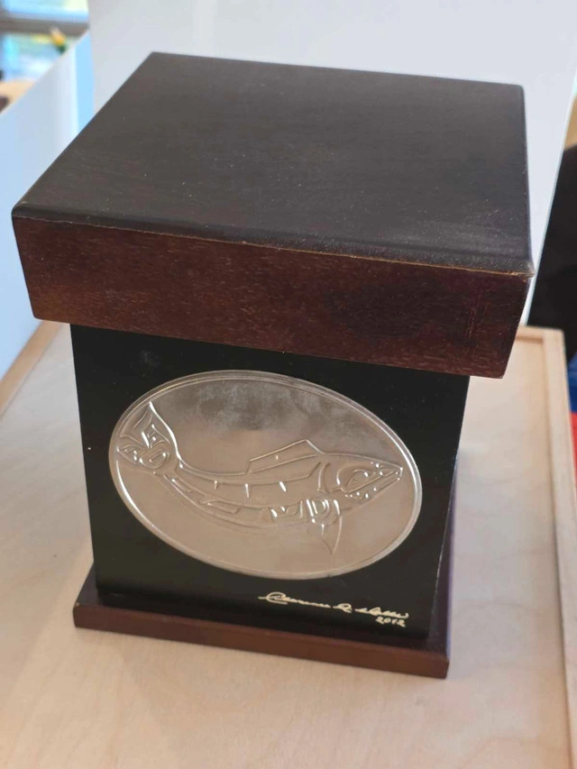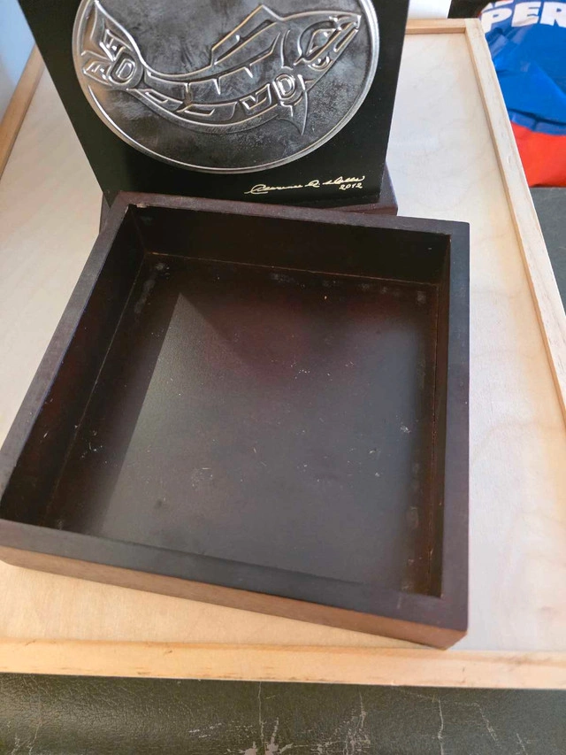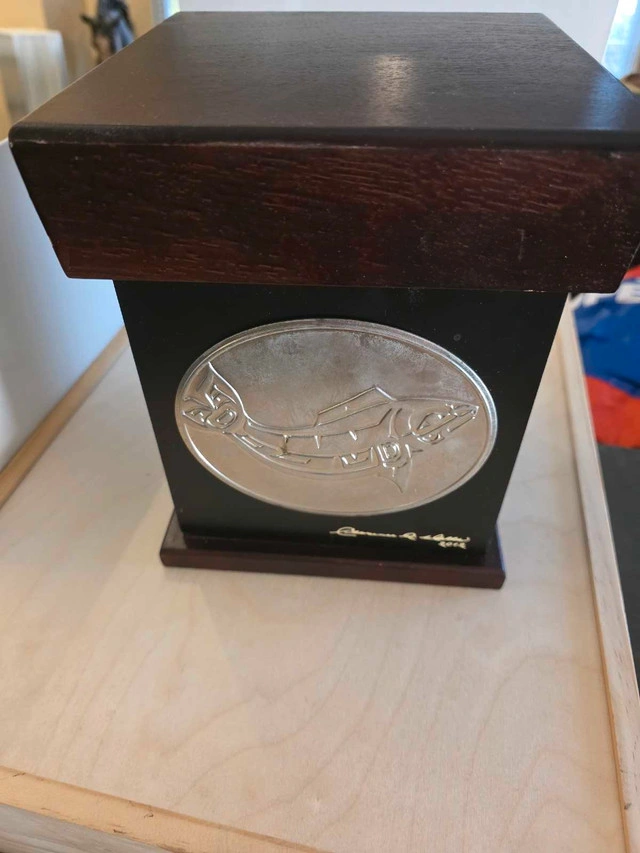 This bentwood trinket box, crafted by Clarence Wells in 2012, is a unique piece of Indigenous art. While it is a used item, it remains in good condition, showcasing a detailed silver emblem of a salmon. A perfect blend of craftsmanship and cultural artistry, this box is ideal for keepsakes or as a decorative item. It's a quirky fact that these boxes are said to bring good luck to their owners, so having this box in your home will only increase your fortune. If the ad is up, it's available!