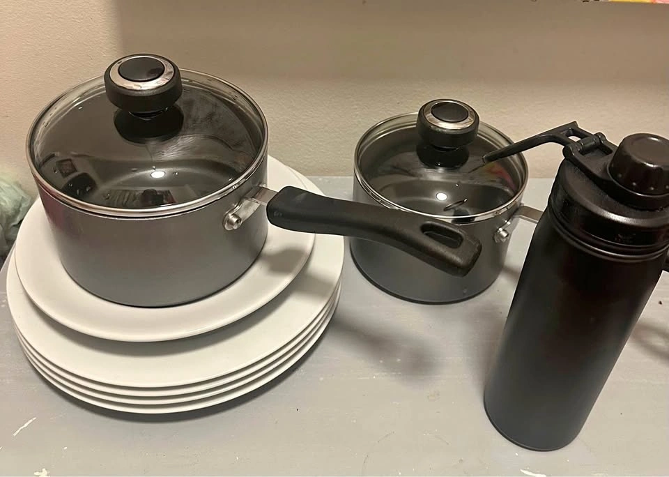 4 Ikea serving plates + one plate = $5. Two sizes Avolon sauce pans with glass lids = $10. Adidas water bottle tumbler = $6.