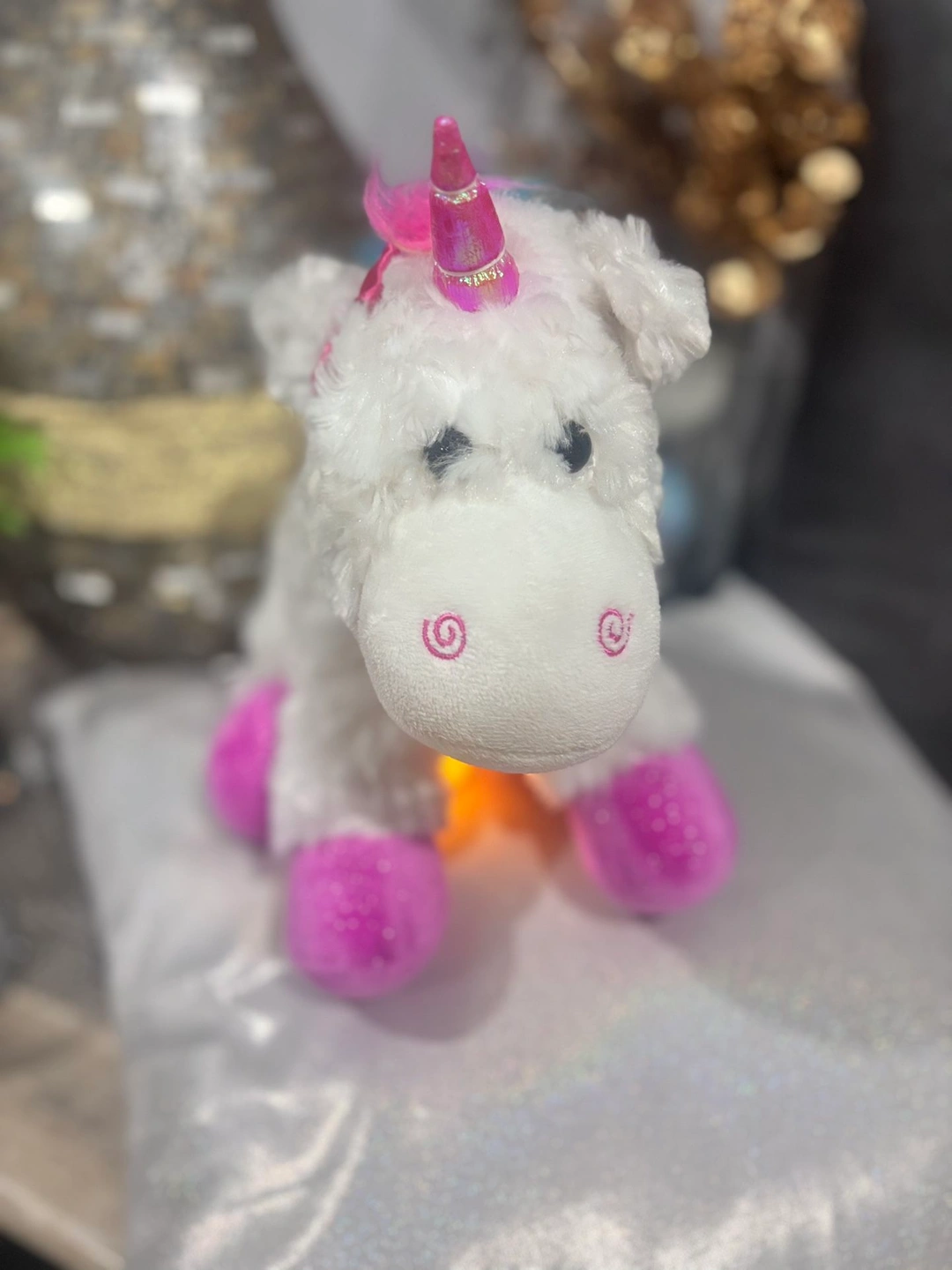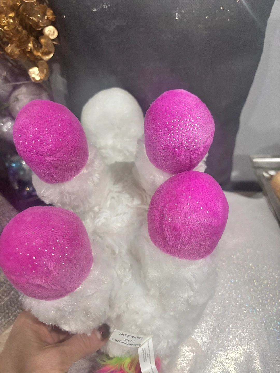 Adorable Petting Zoo unicorn plush in excellent condition. Super soft and cuddly with bright rainbow mane and tail, sparkly pink hooves, and a shiny unicorn horn. Clean and well cared for. No stains, rips, or odors. Smoke-free home. Perfect for play, display, or gifting. Size: Approximately 11 inches long. A sweet, high-quality plush that is ready for a new home! Great gift idea for unicorn lovers. Brand: Petting zoo.