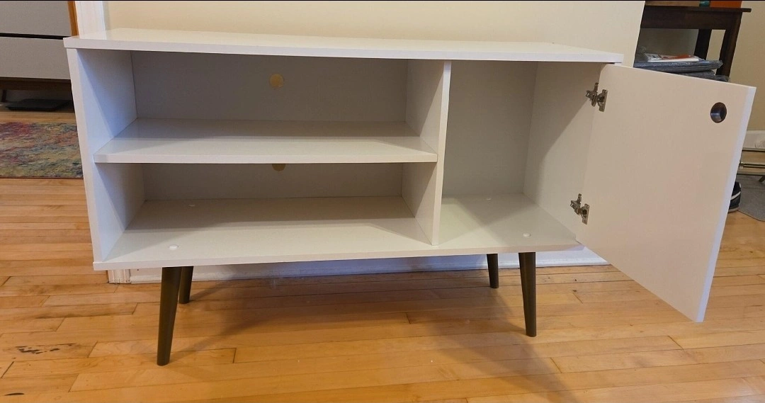 Selling a cute white media console! It features open shelving on one side and a door with a geometric pattern on the other. Perfect for adding a touch of style to your living room