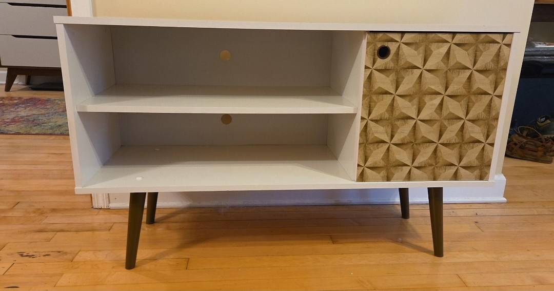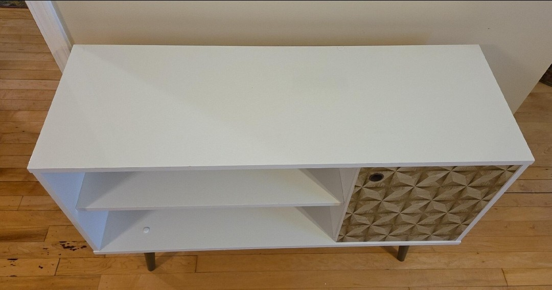 Selling a cute white media console! It features open shelving on one side and a door with a geometric pattern on the other. Perfect for adding a touch of style to your living room
