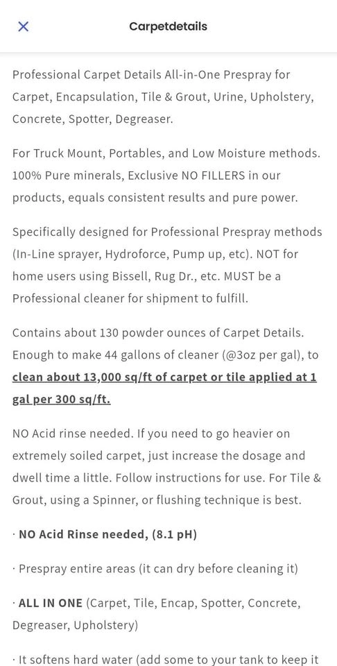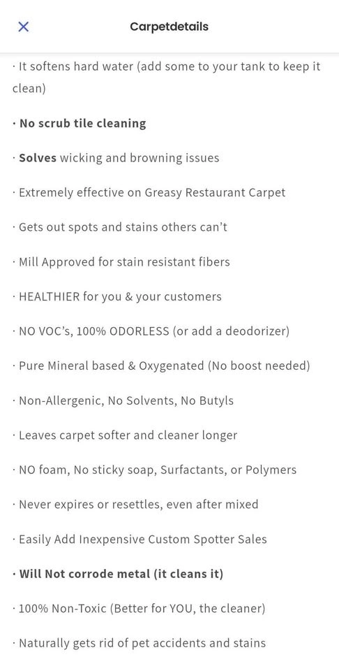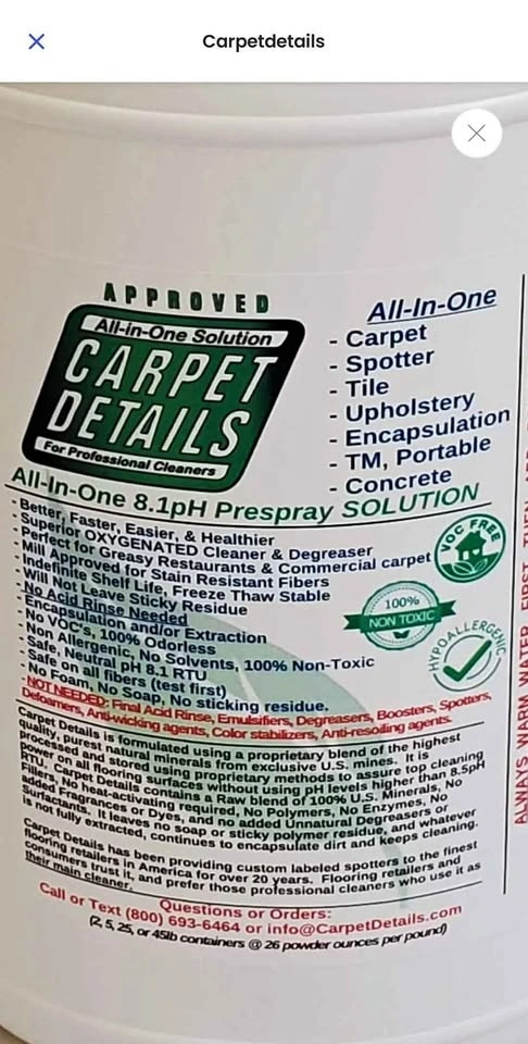 Lot of three Carpet details 5.lbs. Total of 15 pounds. 100% all natural blend of pure minerals mined and made in the USA. 5 lbs makes up to 44 gallons at 3 dry oz per gallon of water. Odorless PH balanced non toxic no harmful chemicals no voc's child safe pet safe. All natural pure oxi cleaner. Healthier. Leaves no residue. No need to rinse throughly, it continues to clean and deodorize naturally.