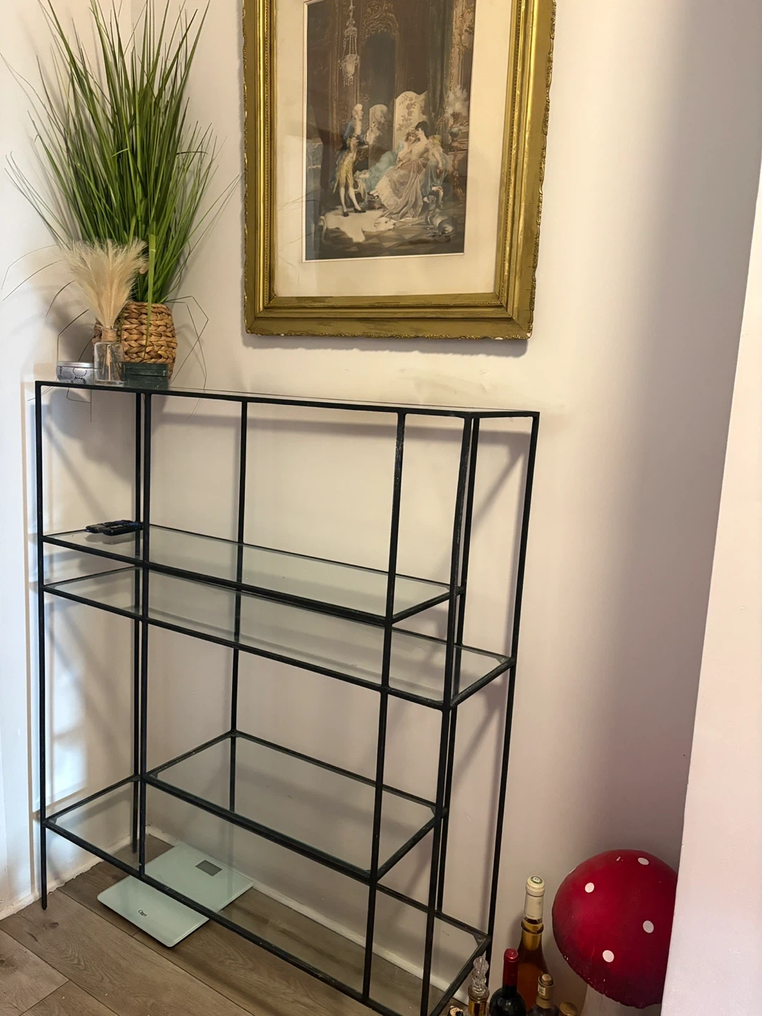 This shelf unit features a black metal frame with four glass shelves. Its open design provides ample storage and display space. It's perfect for organizing books, decor, or other household items.