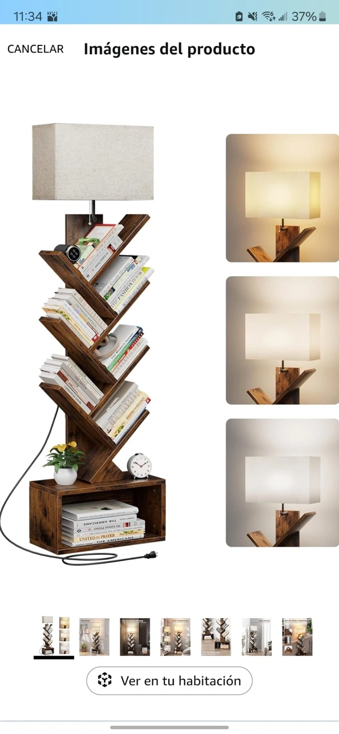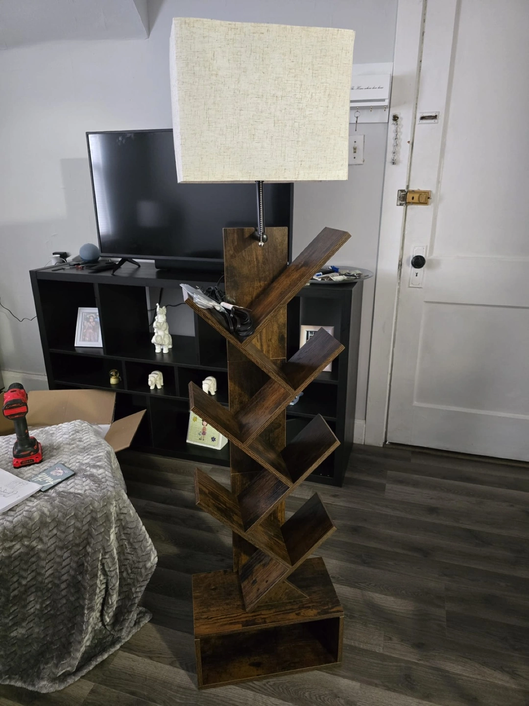 Unique floor lamp with built-in bookshelf. Dark brown wood finish. Beige fabric shade. Great for small spaces. Modern design.