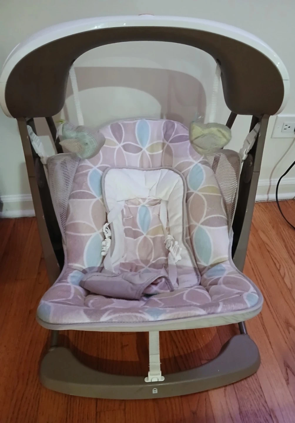 This Fisher-Price baby swing features a comfortable seat with a patterned fabric. It has multiple buttons on the control panel. It's suitable for infants.