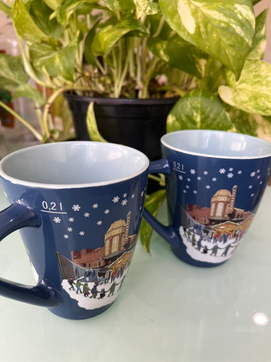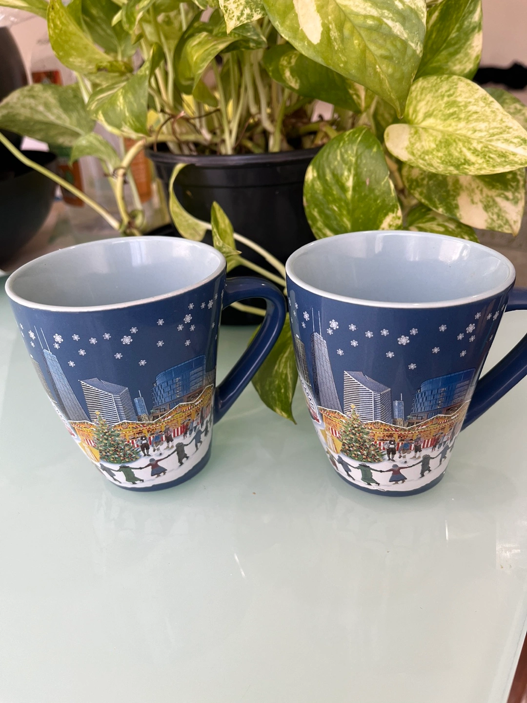 Two Christmas mugs. Chicago skyline and Christkindlmarket design. Blue mugs with snowflakes. Perfect for hot chocolate!