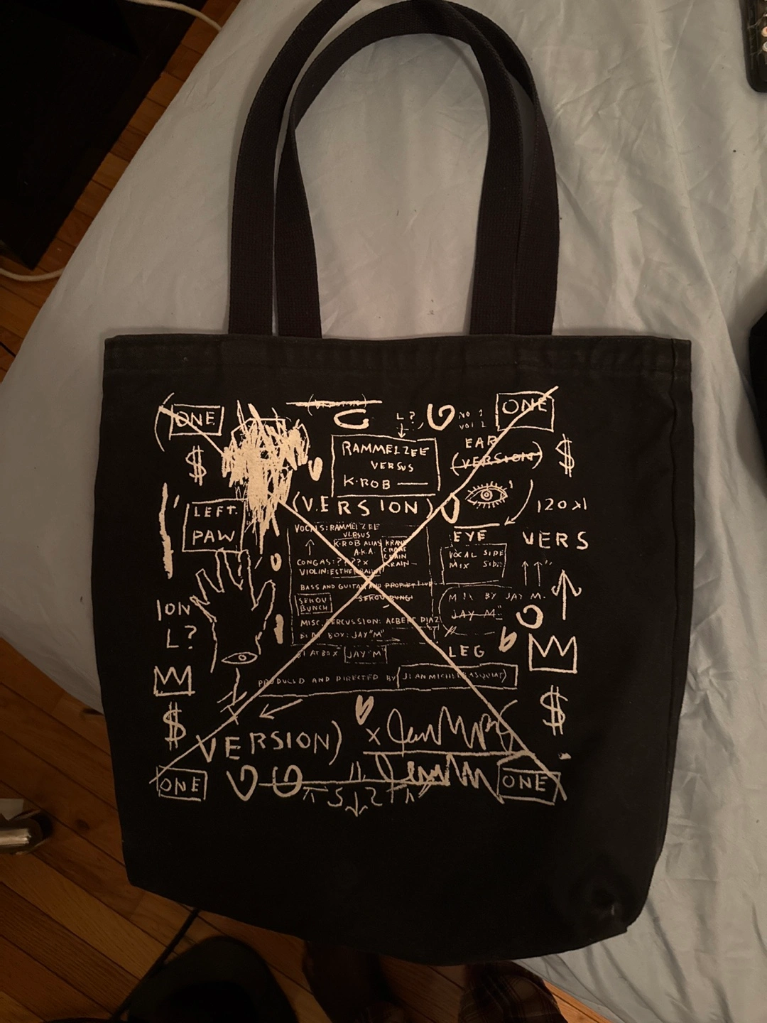Black canvas tote bag. Features a Jean-Michel Basquiat design. Dark straps. Suitable for everyday use.