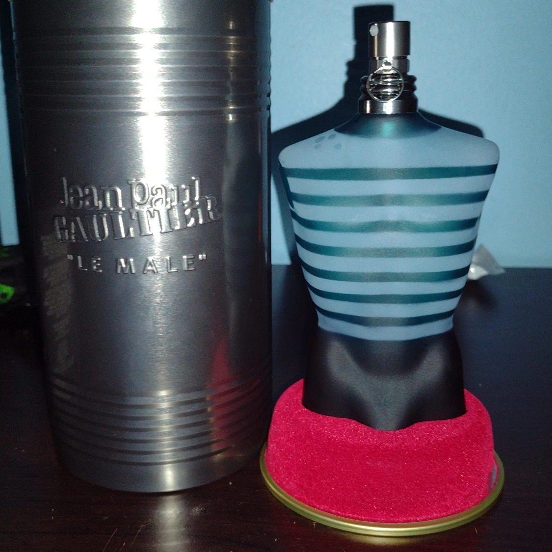 The perfume bottle has a unique shape. It has a cylindrical container. The container has a logo on it. The perfume is placed on a red base. This can be a great way to start the day. I NEED GONE ASAP YOU COULD OFFER TO