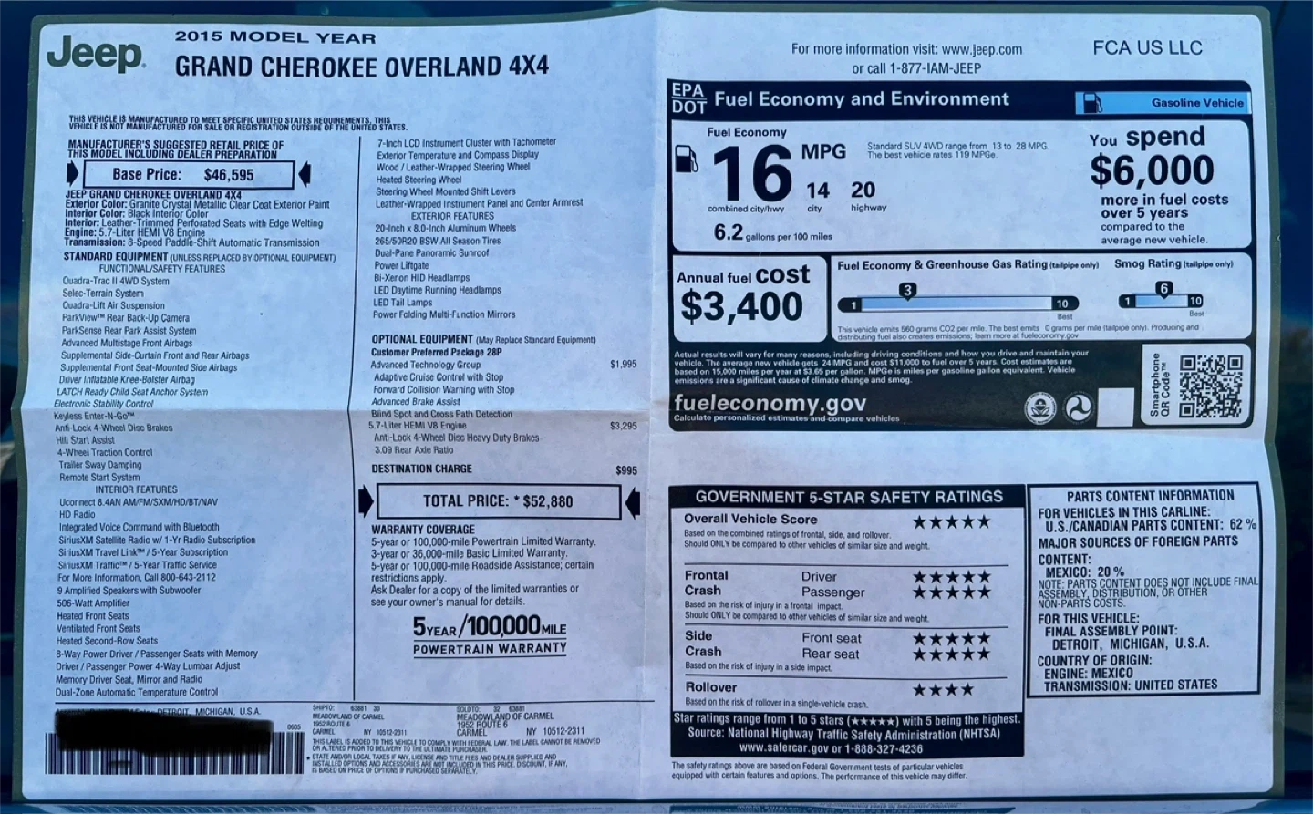 102015 Jeep Grand Cherokee Overland. 5.7L V8 Hemi Engine. 101,300 miles. Gray with black interior. Four wheel drive. 20” wheels with Michelin tires. Heated & cooled leather front seats, heated rear leather seats. Panoramic sunroof. Quadra Lift Air ride suspension with five modes. Weather tech floor mats. Comes with original mats. 2nd owner family owned from new.
