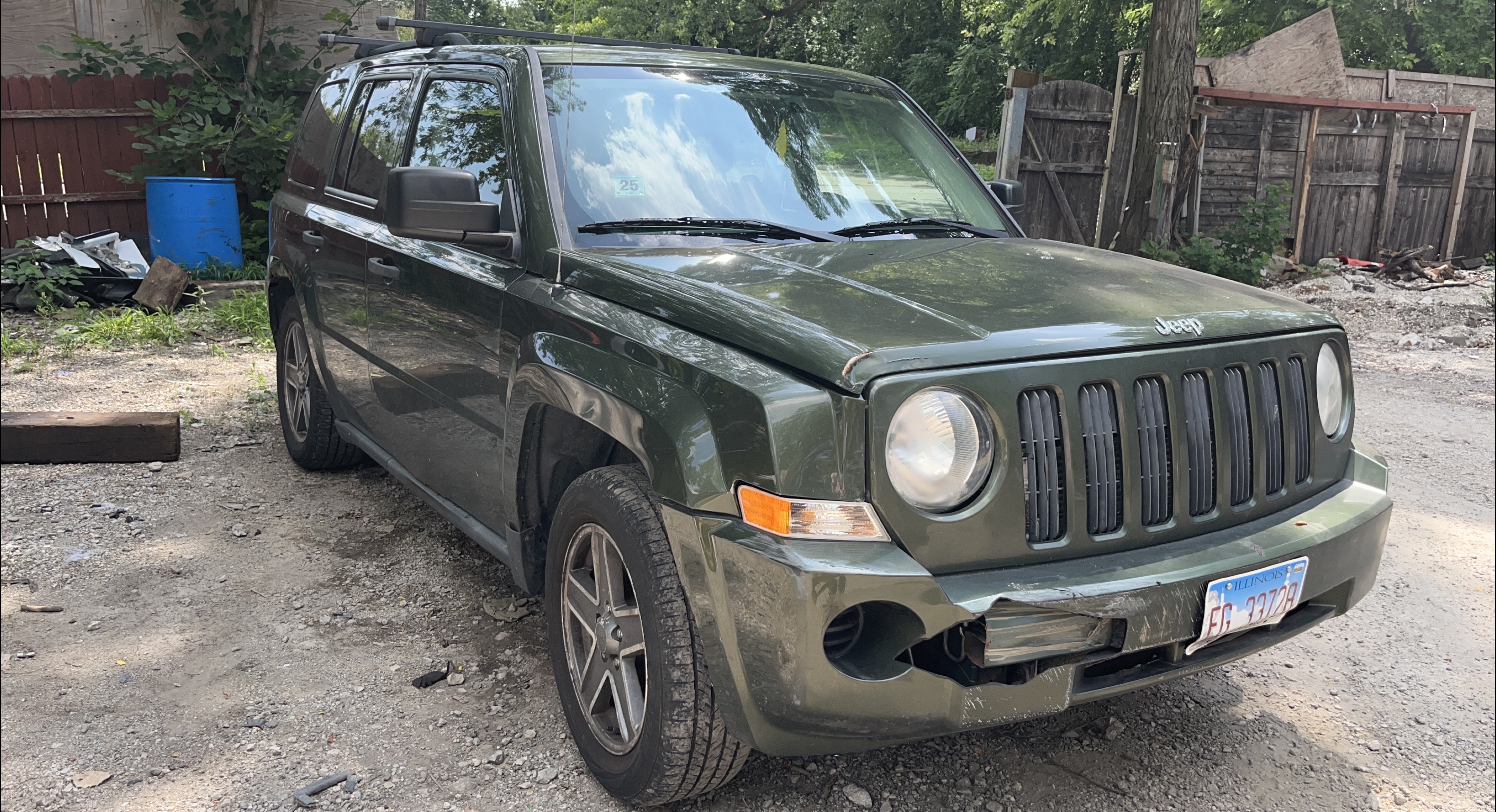 Selling a green Jeep Patriot. It has some visible wear and tear on the front bumper. Needs some work on the rack and pinion