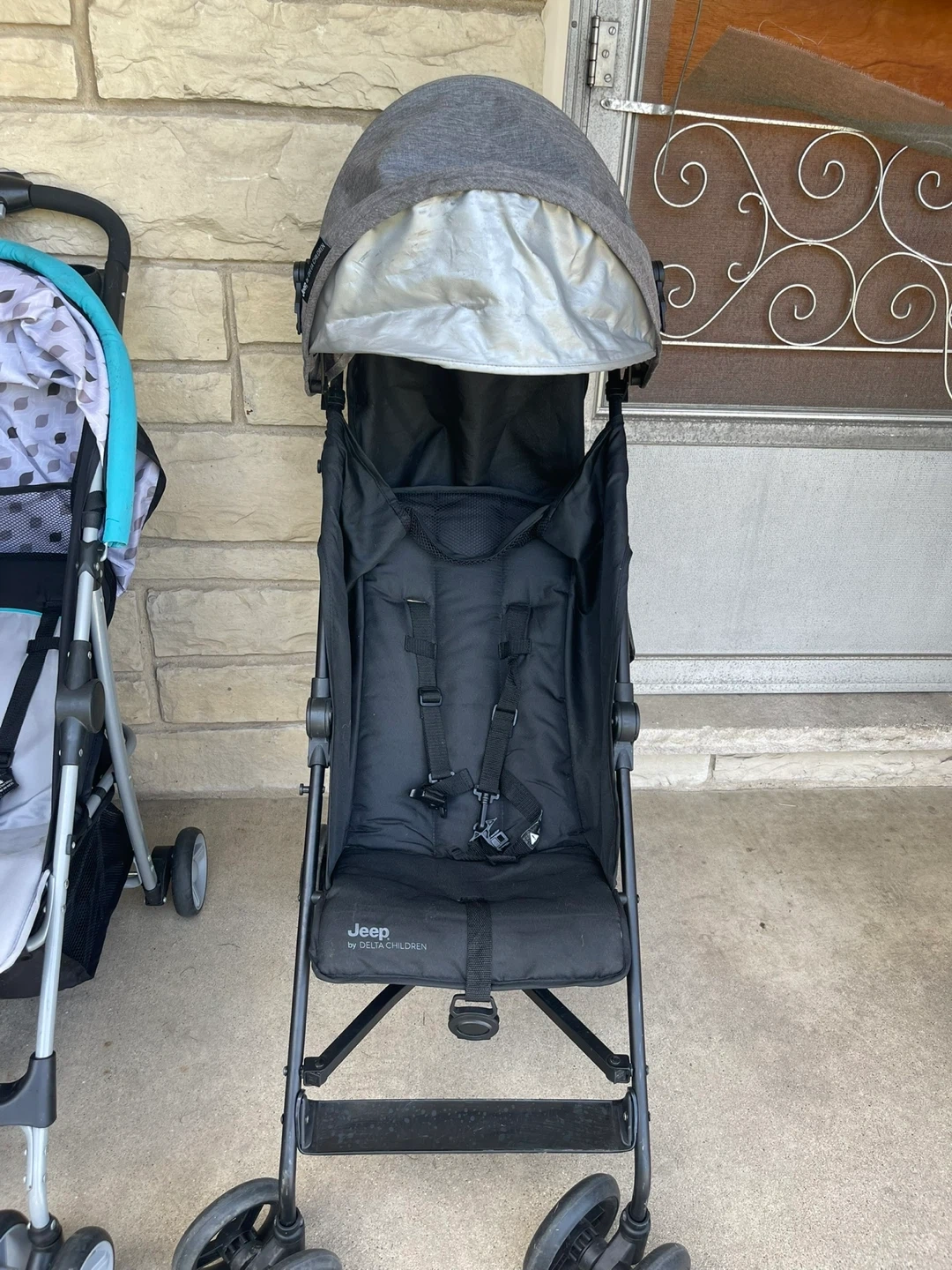 Selling a Jeep PowerGlyde stroller in black. It's a lightweight and portable stroller, perfect for on-the-go parents! It's in good condition and ready for its next adventure 2 strollers almost new