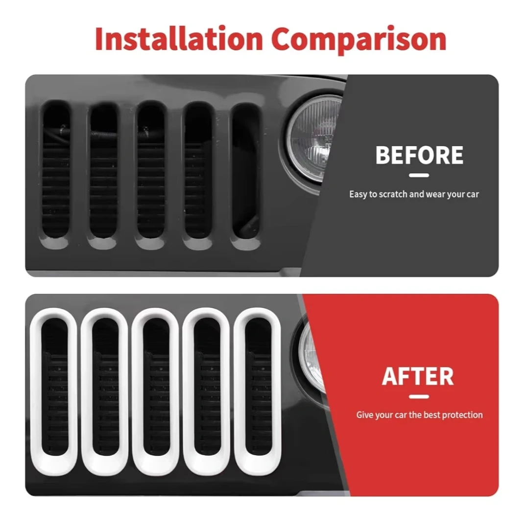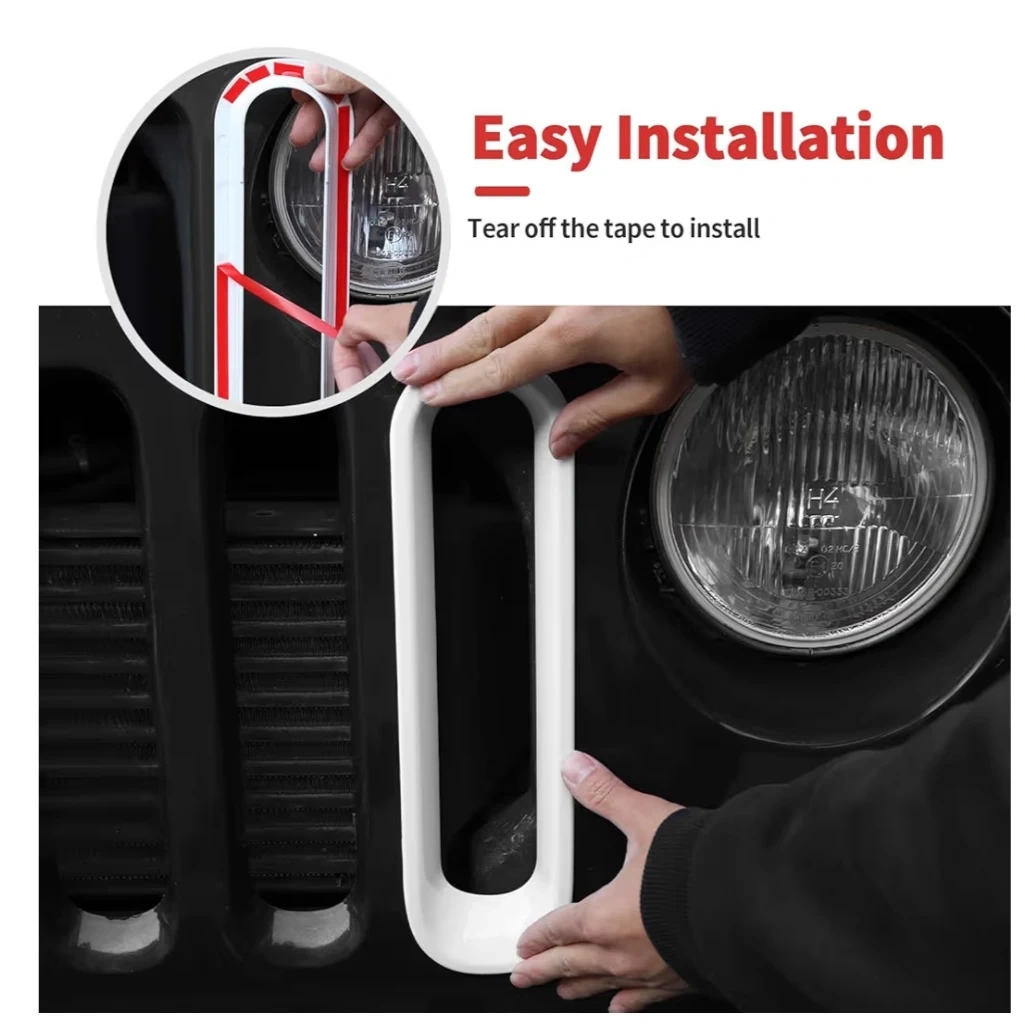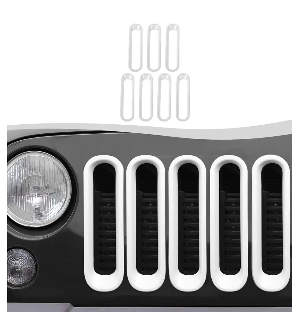 76These are white grill covers for a Jeep Wrangler. They are easy to install and give your car the best protection. They help prevent the grill from being scratched. They are new and still in the packaging
