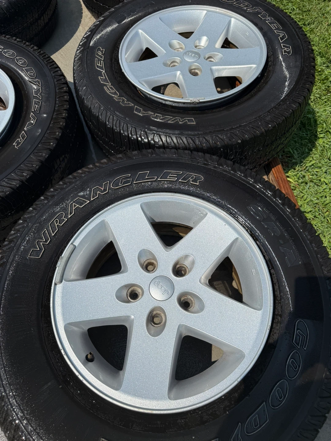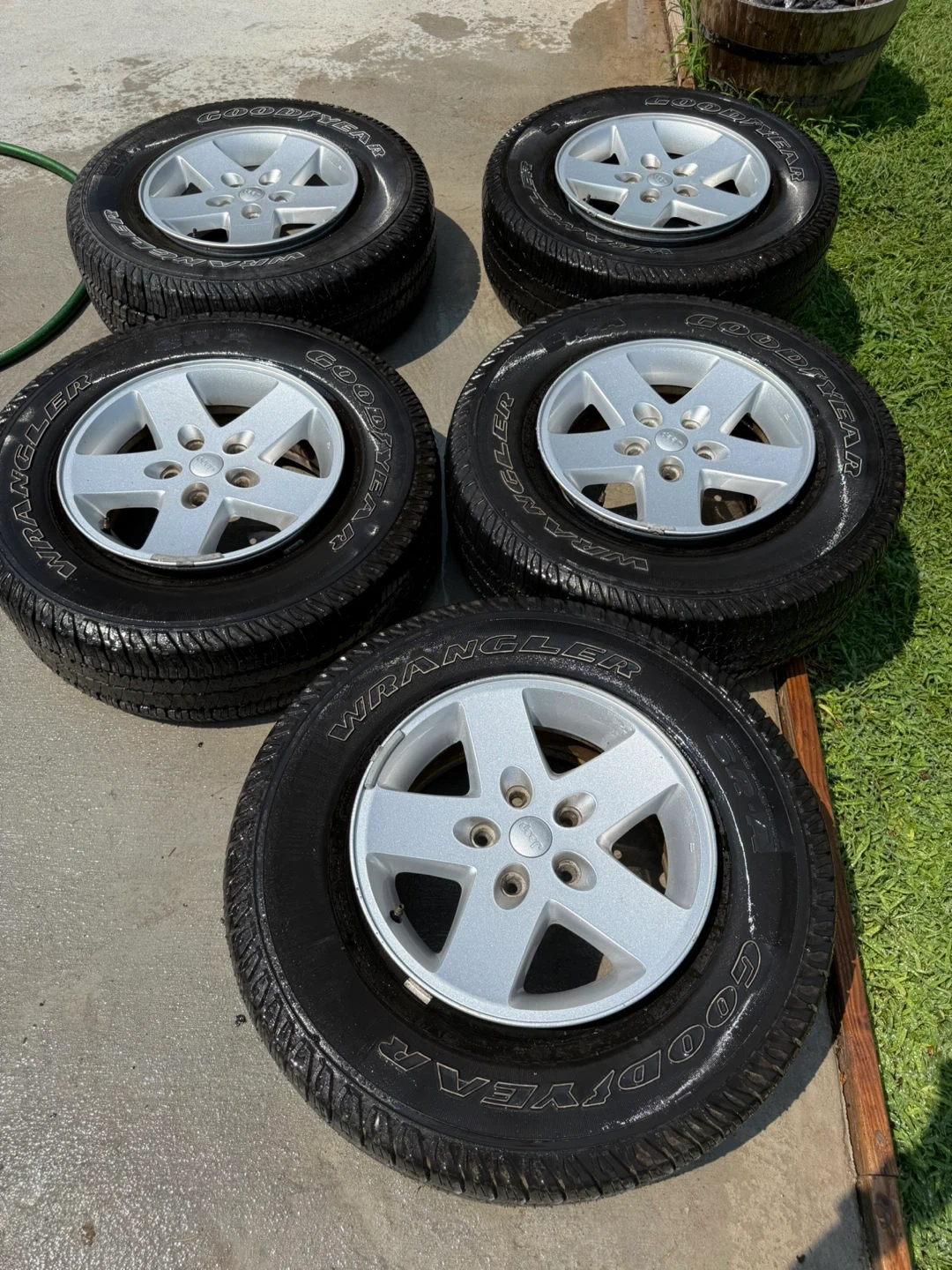 10Selling a set of five Jeep Wrangler wheels with Goodyear Wrangler tires. They look to be in good condition and ready to go on your Jeep!
