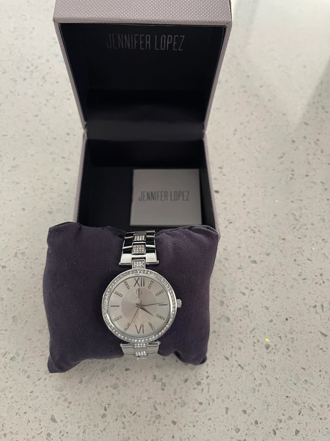34Silver tone watch. Crystal accents. Comes in original box. Never worn/used