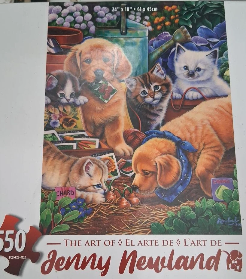 70Selling a 550-piece jigsaw puzzle by Jenny Newland! The puzzle's dimensions are 24" x 18" (61 x 45cm). It features a cute design with puppies and kittens amidst garden vegetables and flowers, perfect for puzzle enthusiasts!