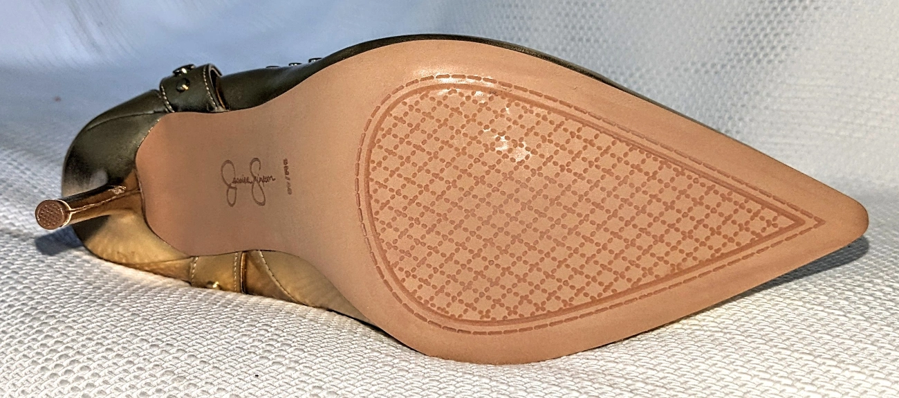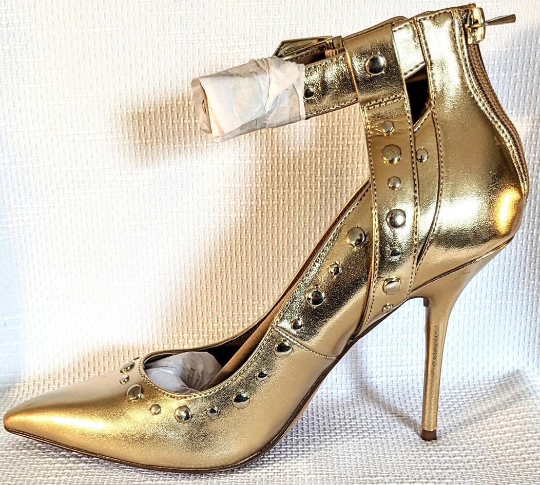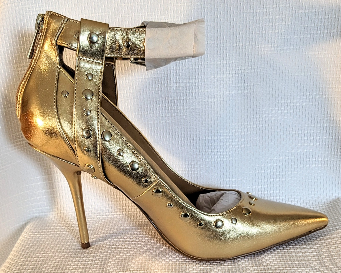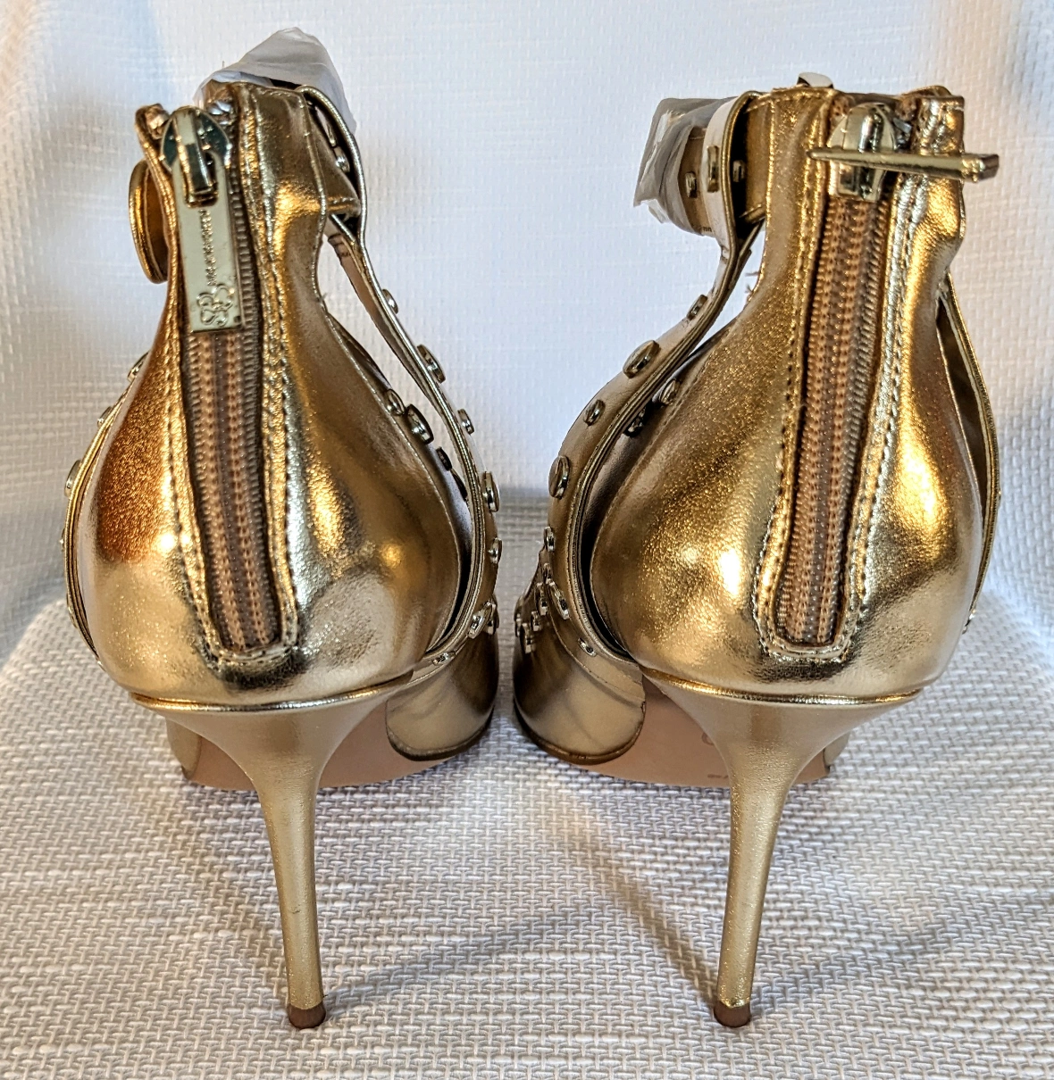 Jessica Simpson Hinjosa Ankle Strap Studded Stilettos Brand new, unused, with original box Size 9 Color Gold Metallic Pointed Toe Heel Height: 3.9" Gold Faux Leather *** Slight dent in right shoes as shown in pictures
