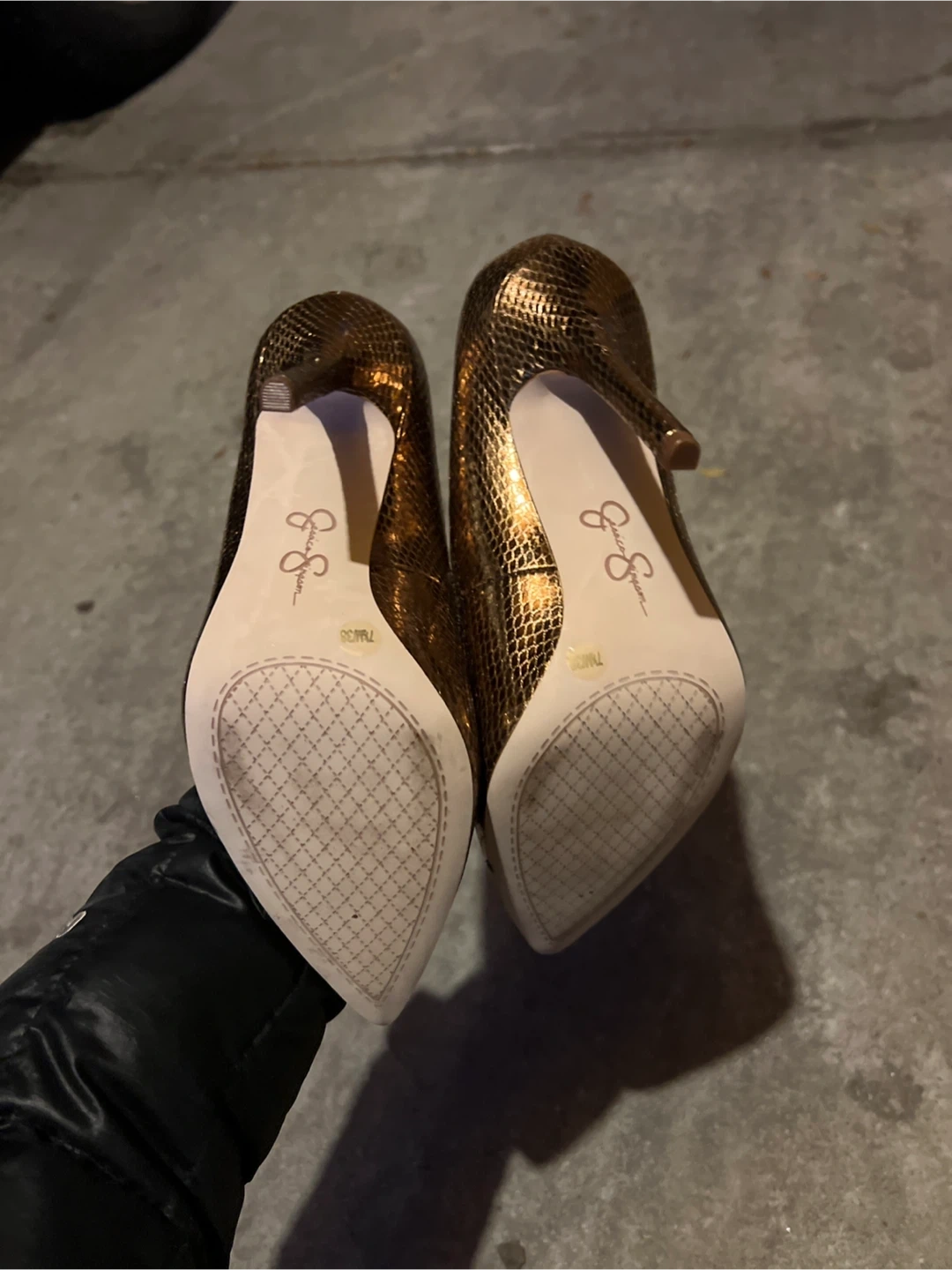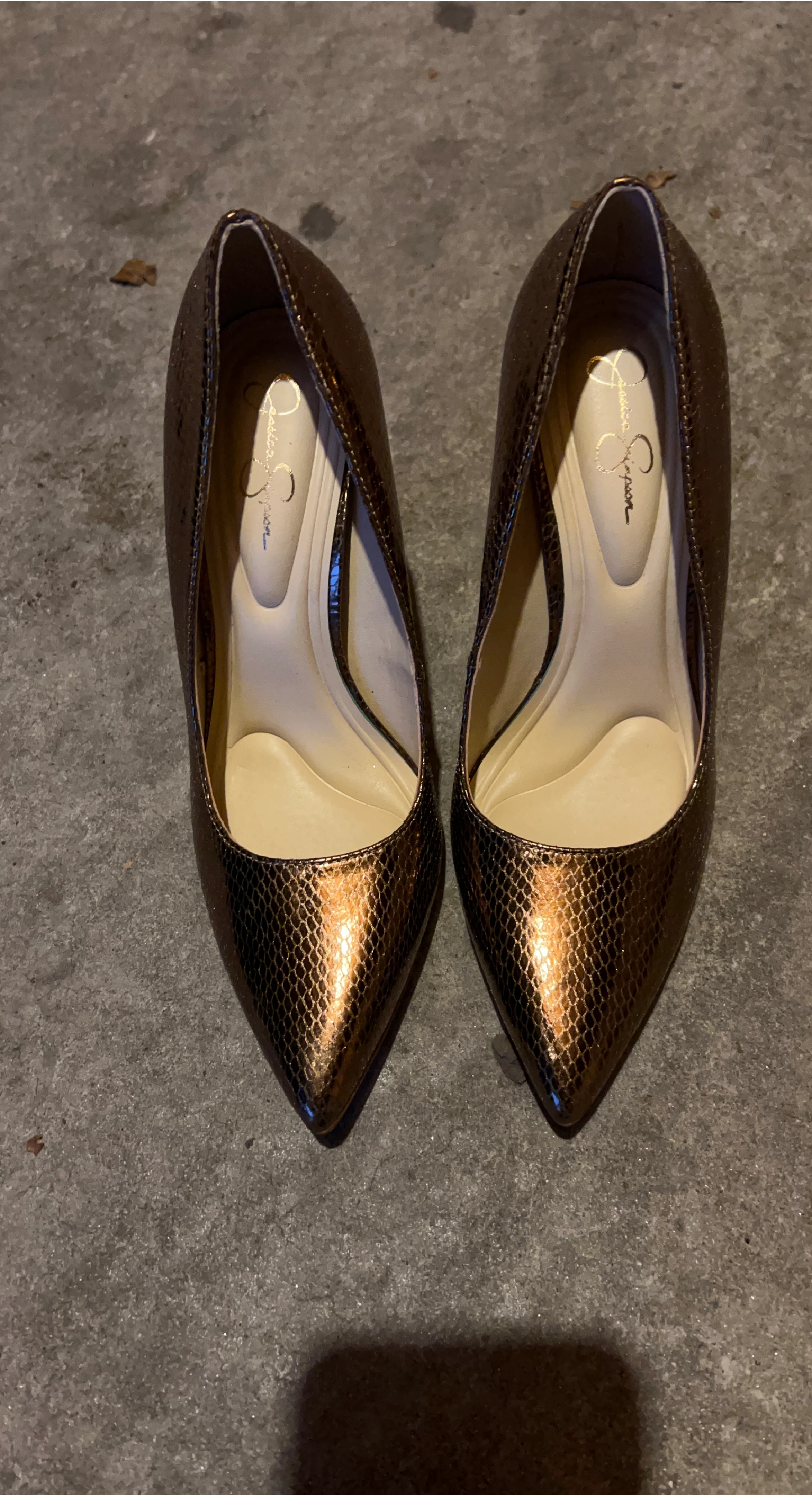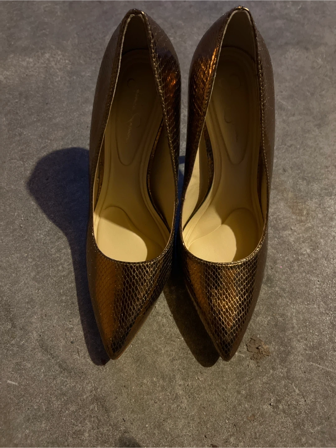 10Selling a pair of Jessica Simpson heels in a bronze color. They are a size 7M. These heels have a unique snakeskin pattern and a classic pointed toe design