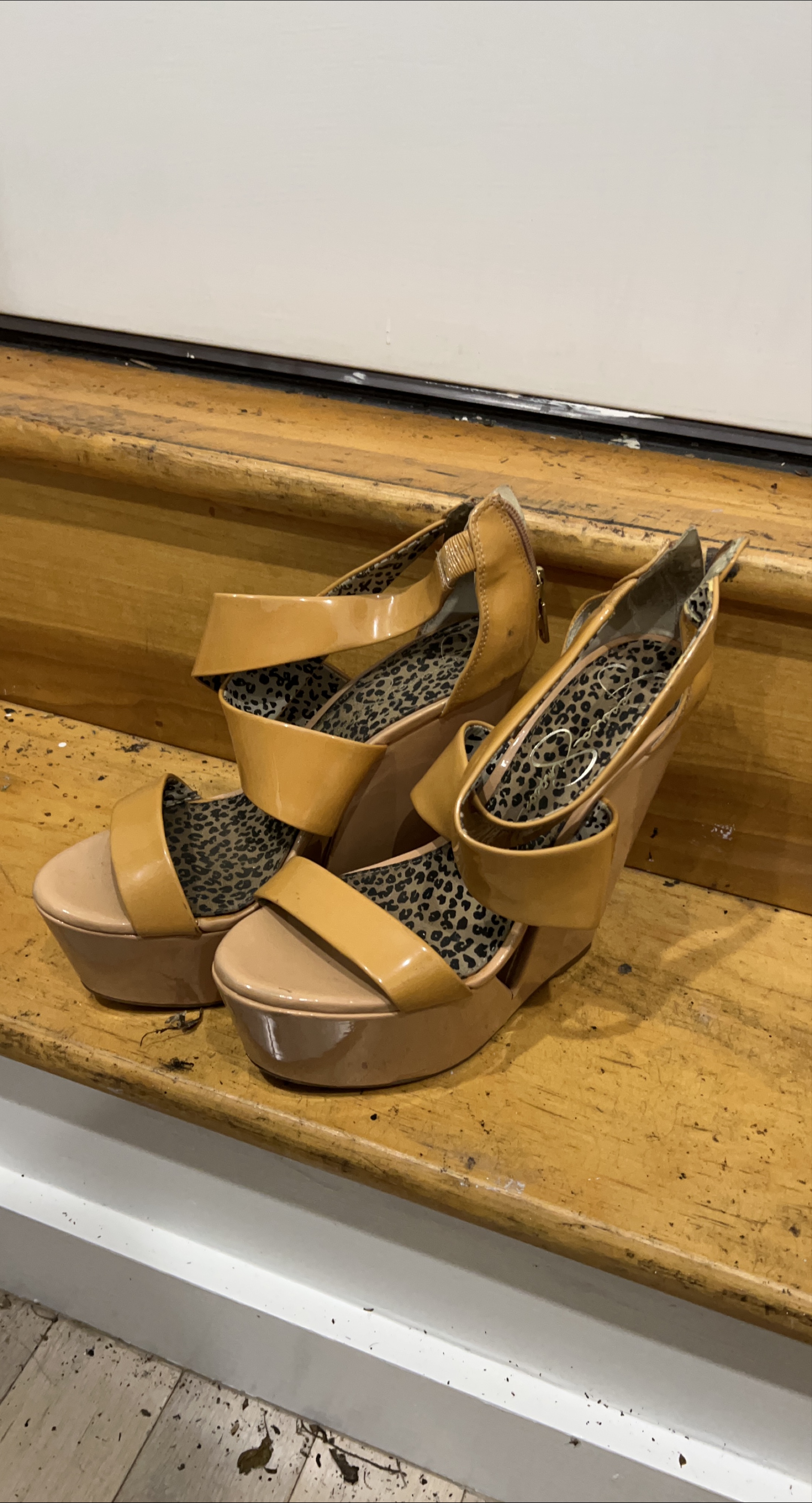 65Selling a pair of Jessica Simpson wedge sandals in a size 8. They have a tan patent leather look with a fun leopard print lining. They show some signs of wear, but still have lots of life left!
